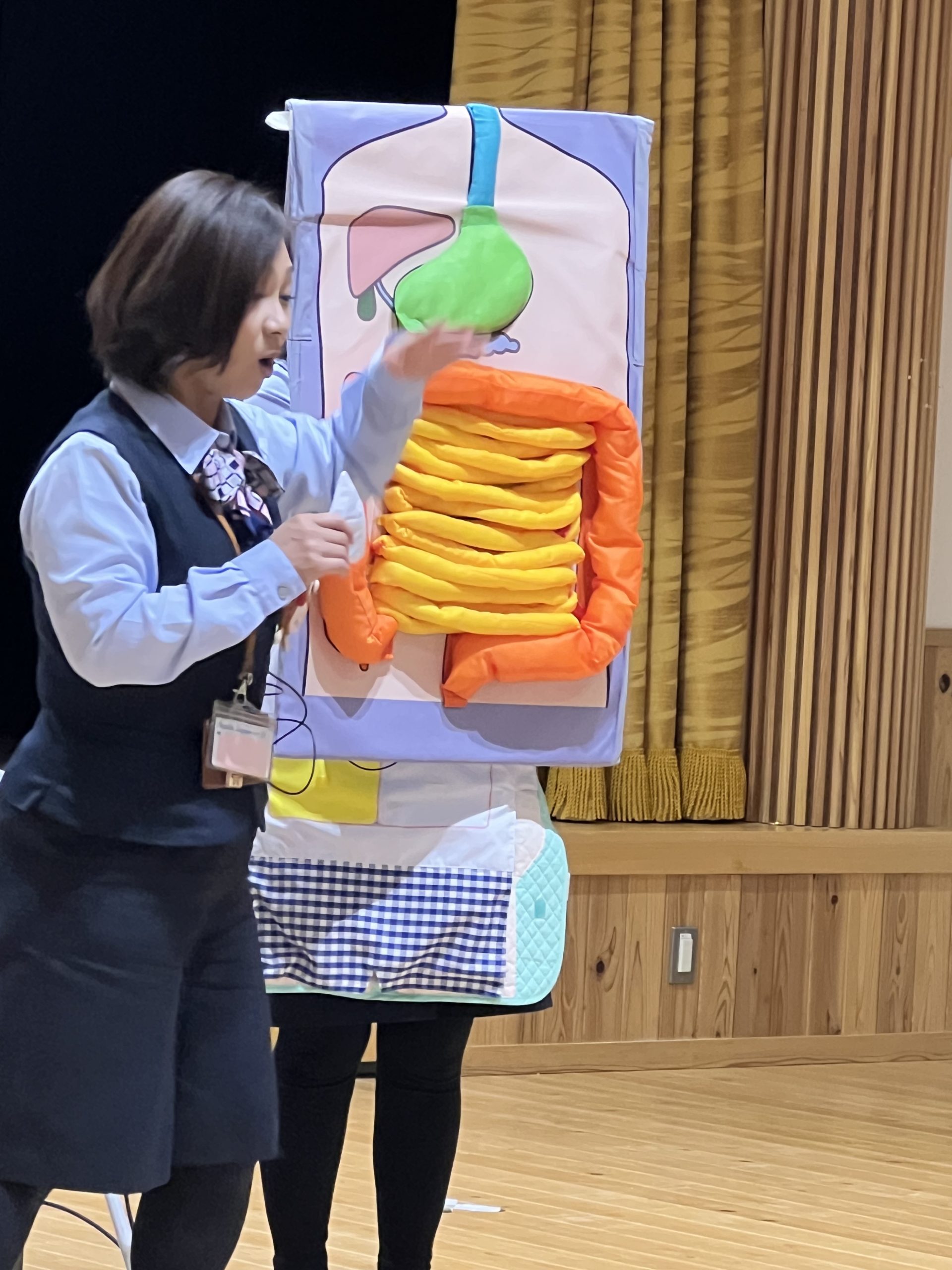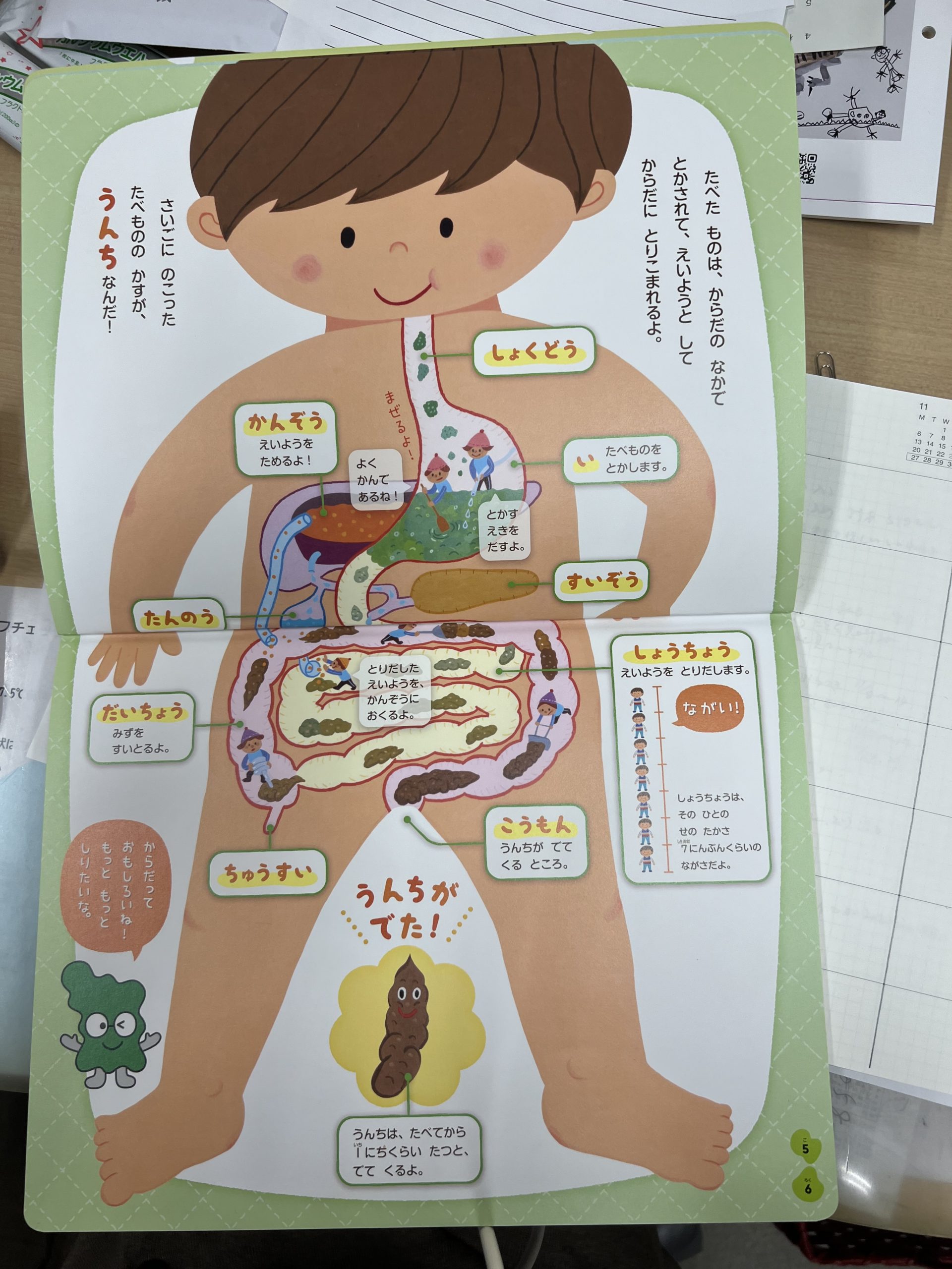 年長組の子どもたちは身体の仕組みの図を見て、質問されることに「そこはいだよ」「しょうちょうだよ」「だいちょうだよ」と分かって答える姿に感心してしまいました。