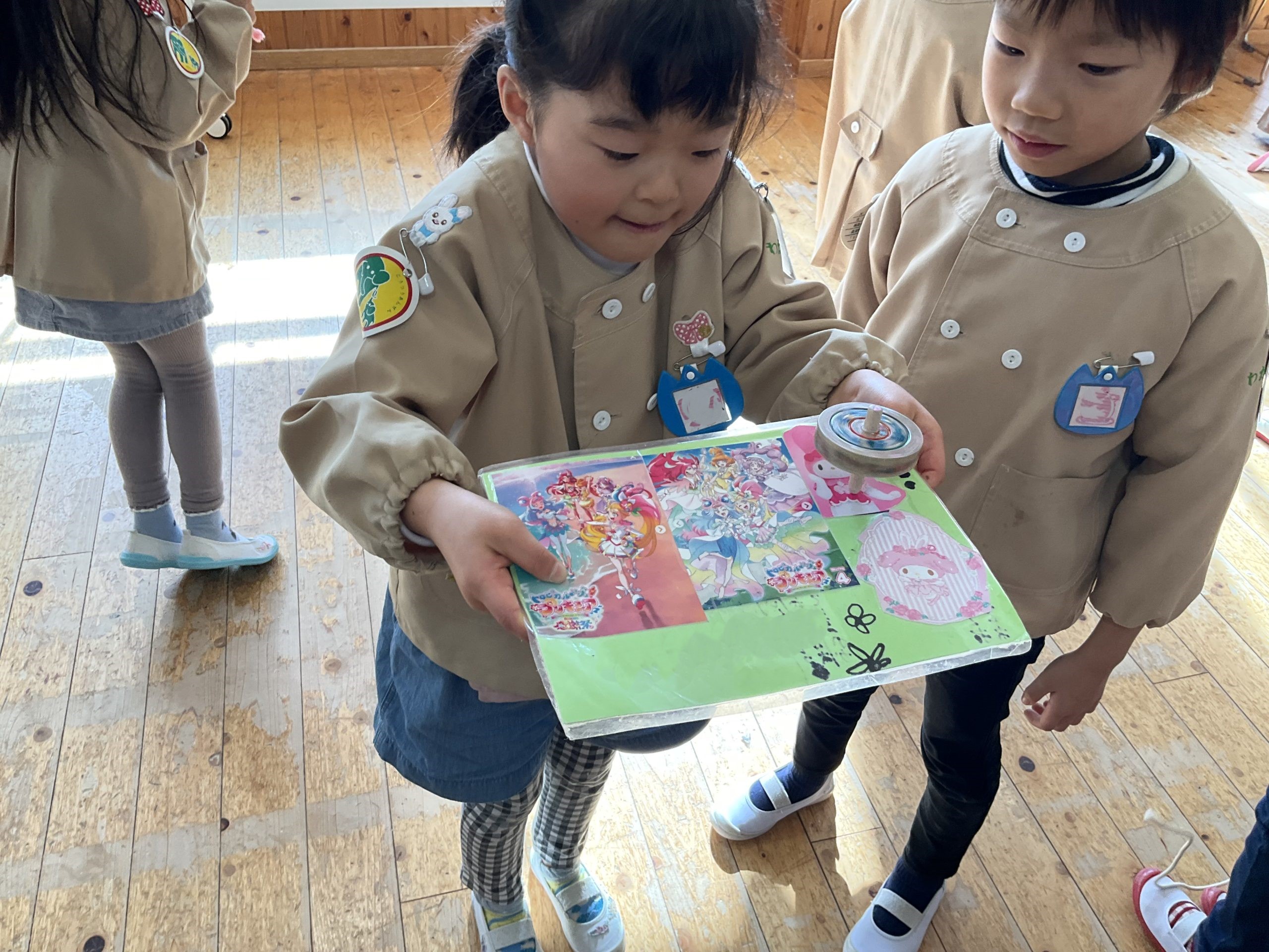 「きんちょうするわ!」と話されながらも、ずっと板の上で回るコマ・・・。