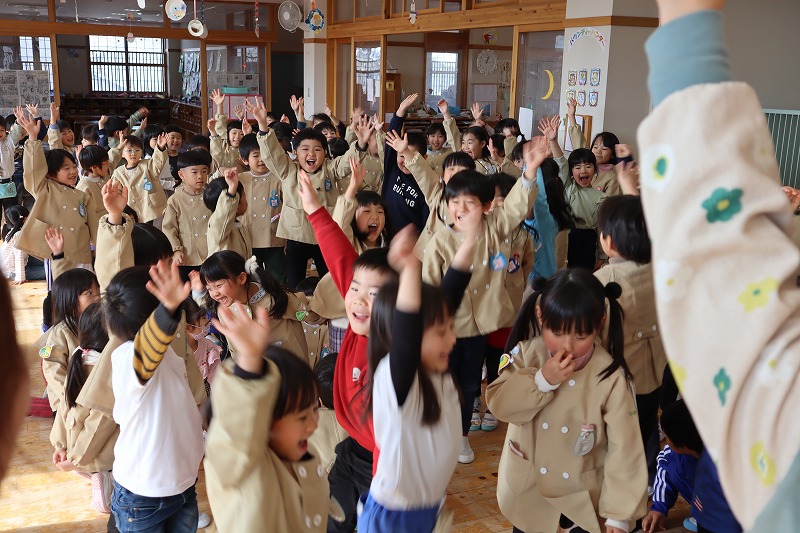 子どもたちから催促されて、ニコニコ顔の先生たち。