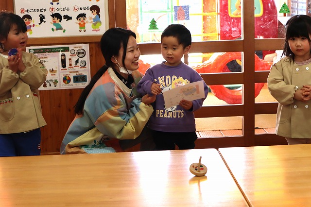 「あの日の夜、どうしたら長く駒を回せるか、家族で何度も練習しました。一生懸命に取り組んでいる年長組のおともだちへどのように伝えたらもっとわかりやすかったかと考えても答えは出ず、人に教えるというのは本当に大変なことだなと、先生方のお仕事の大変さと愛情と知識を与えていただいていることにありがたいなと実感いたしました。」