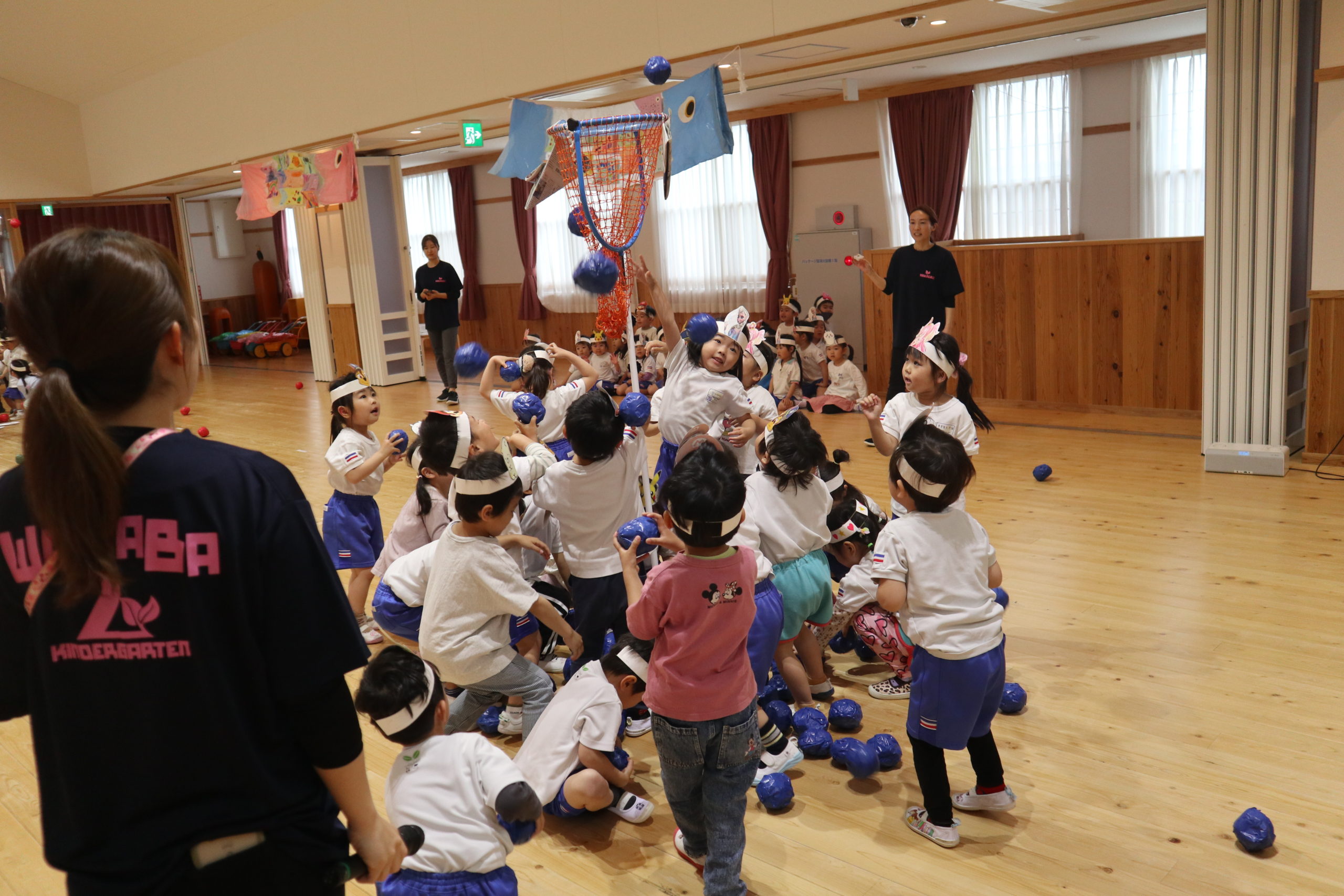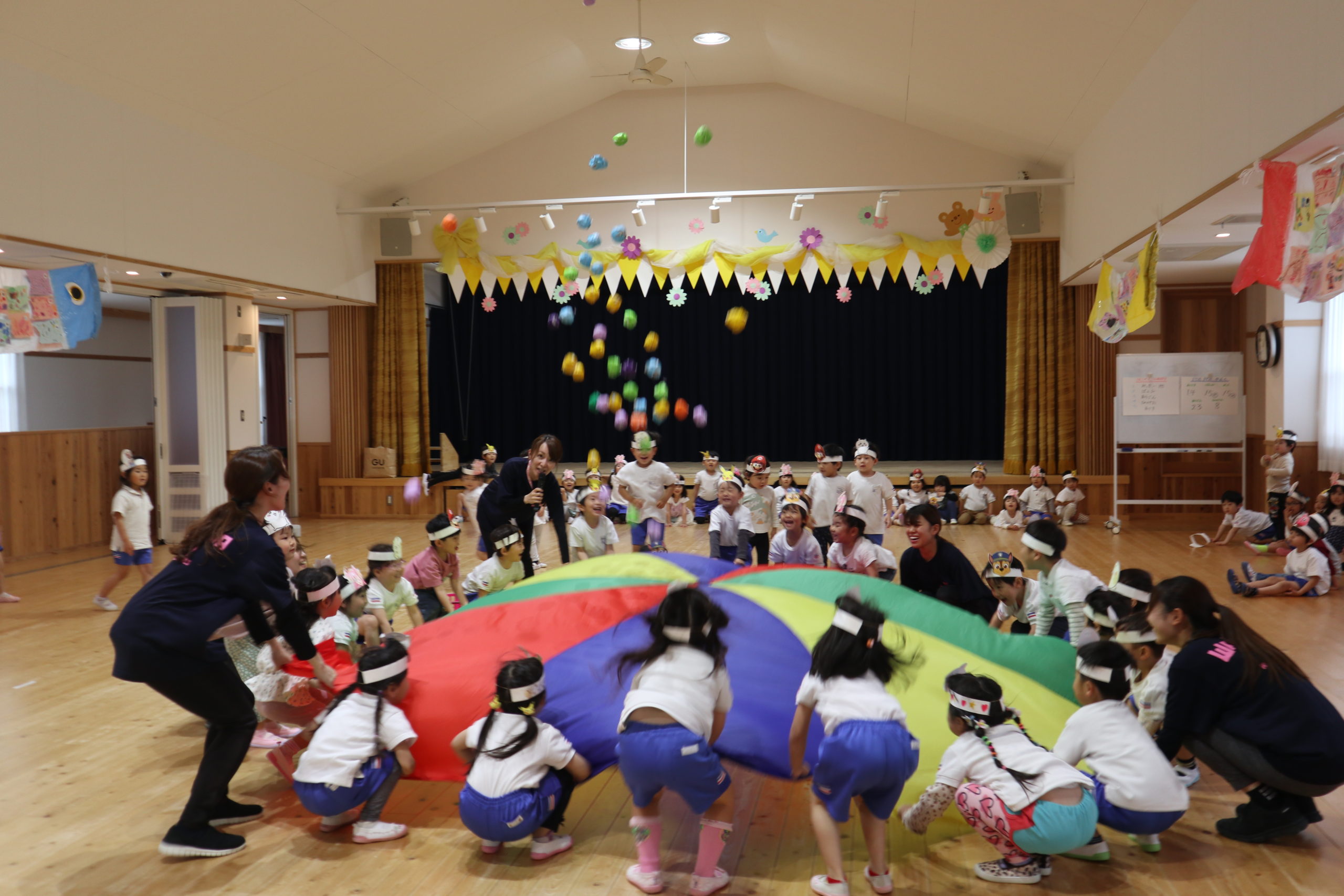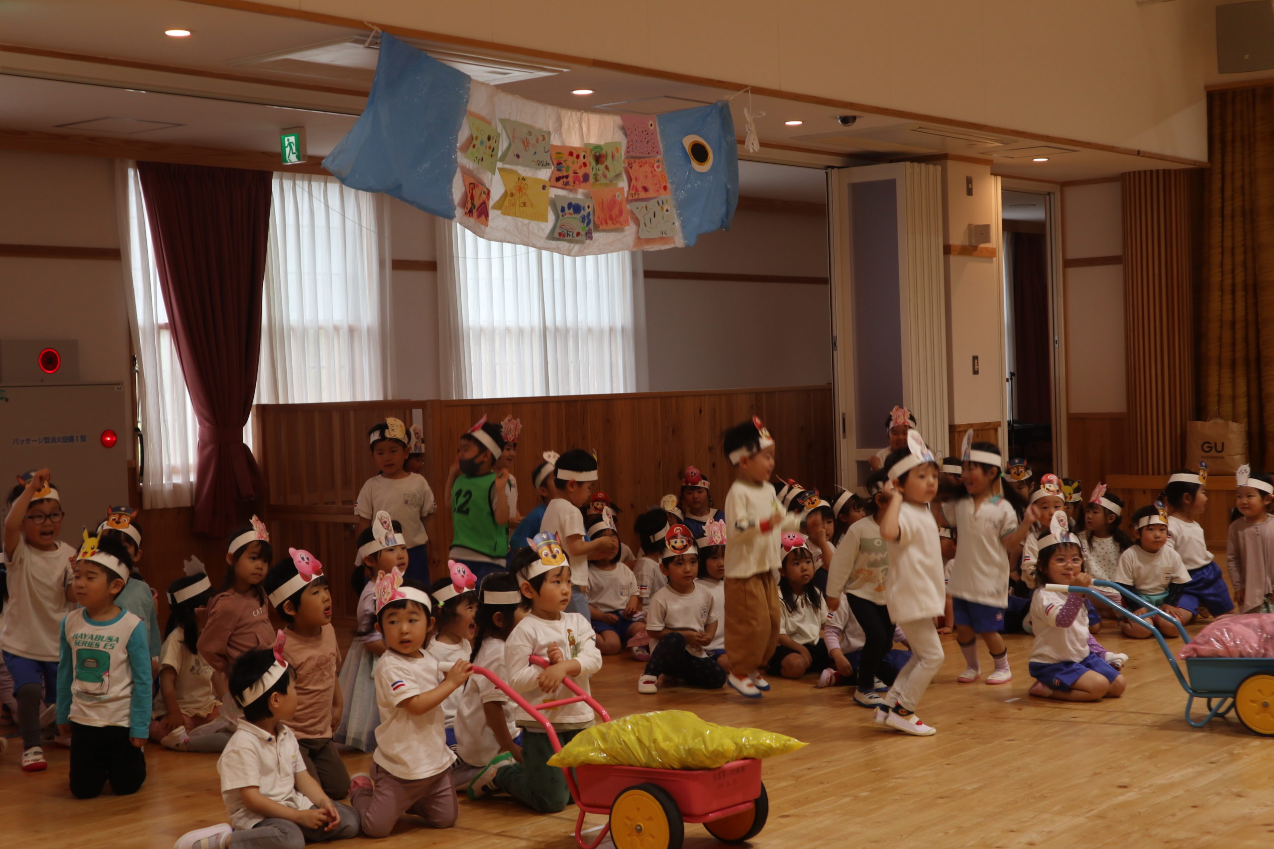 3つの種目、『つなひき』・『でかぱんきょうそう』・『およげこいのぼり』にそれぞれ勝ったクラスにお花がつきます。