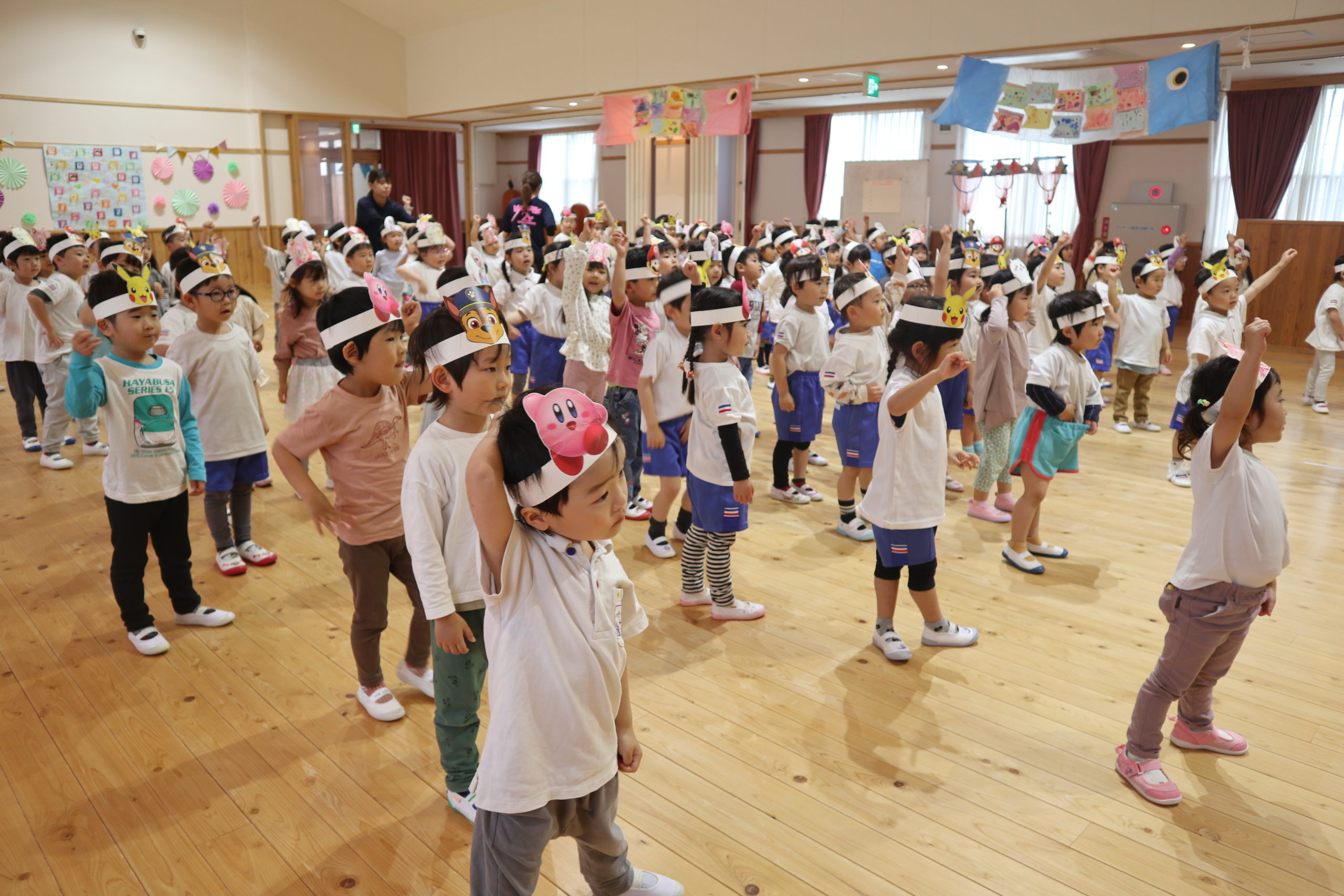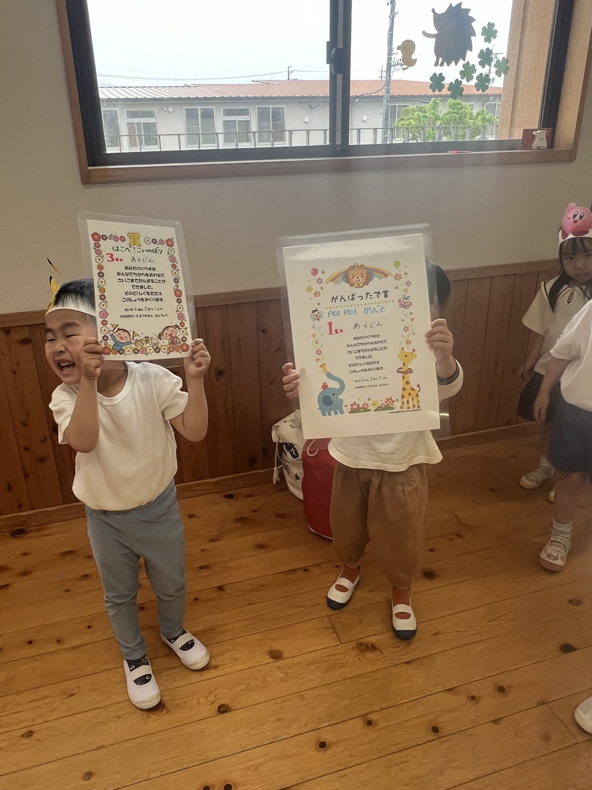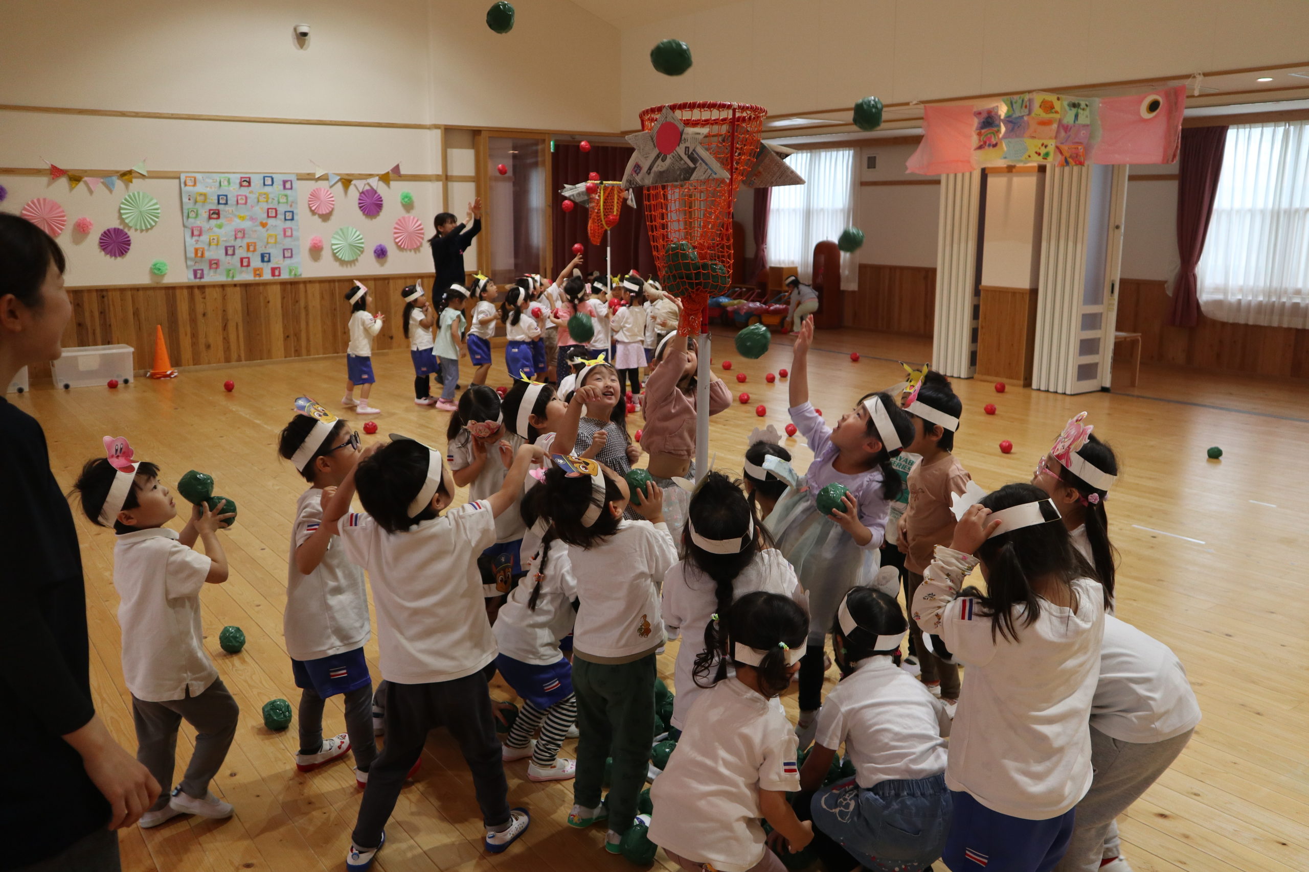 3つの種目、『つなひき』・『でかぱんきょうそう』・『およげこいのぼり』にそれぞれ勝ったクラスにお花がつきます。