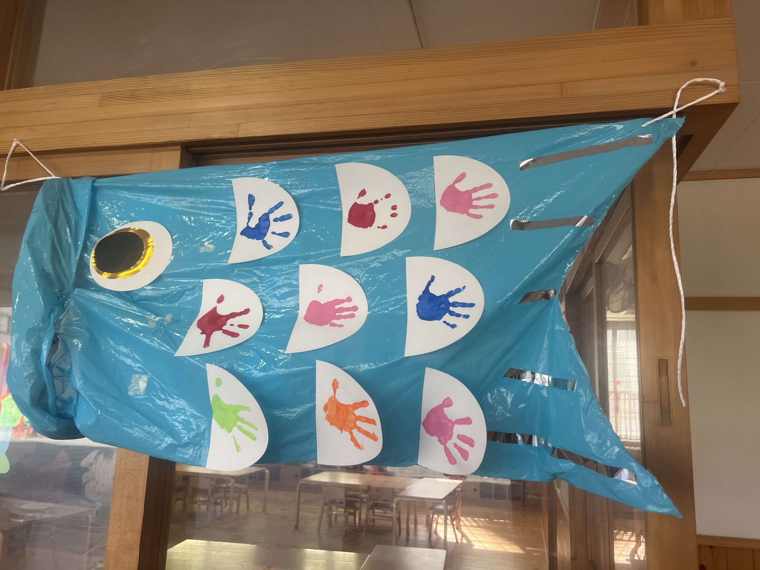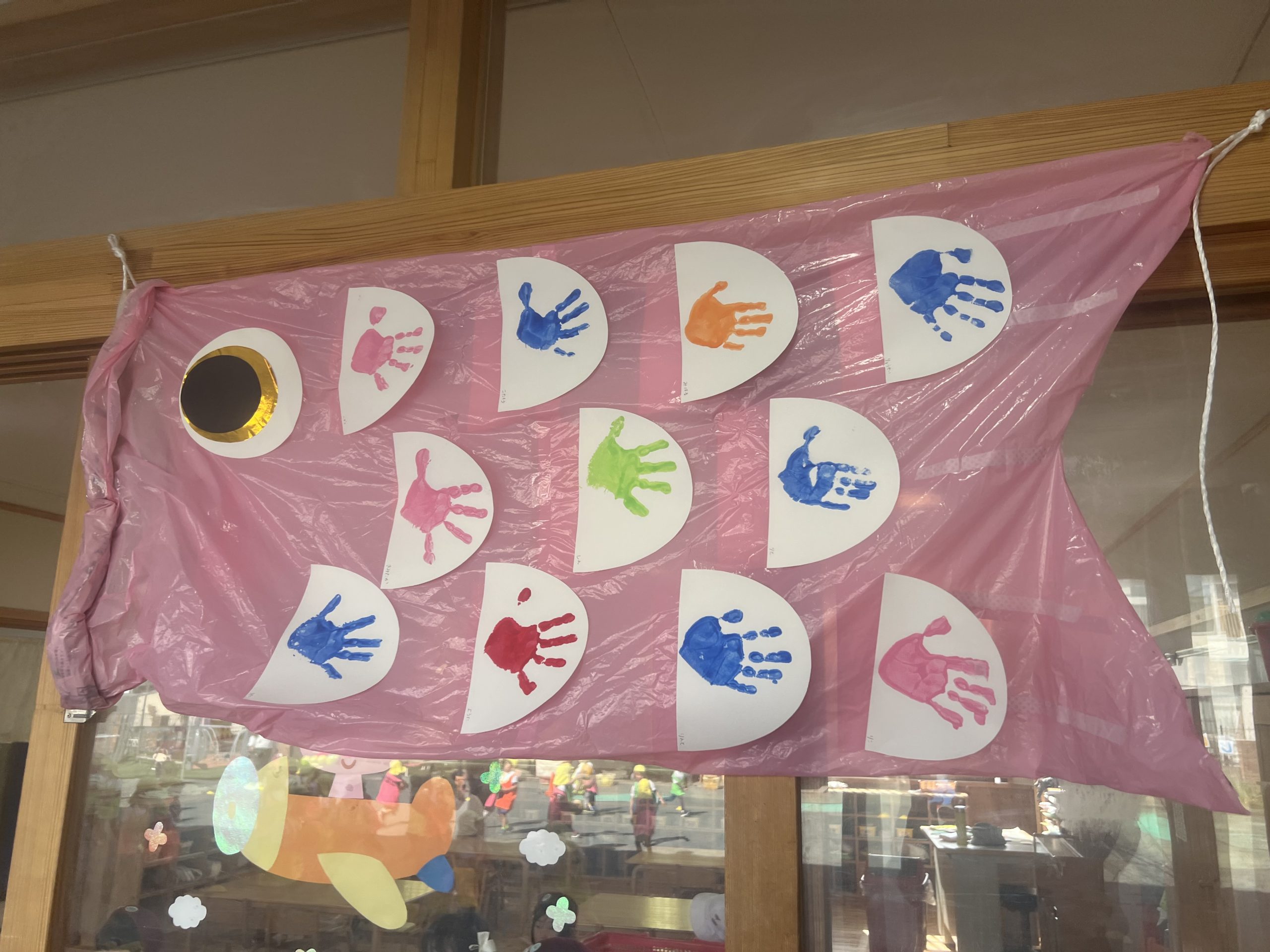 幼稚園にも子どもたちが作ってくれたこいのぼりが勢いよく泳いでいます。