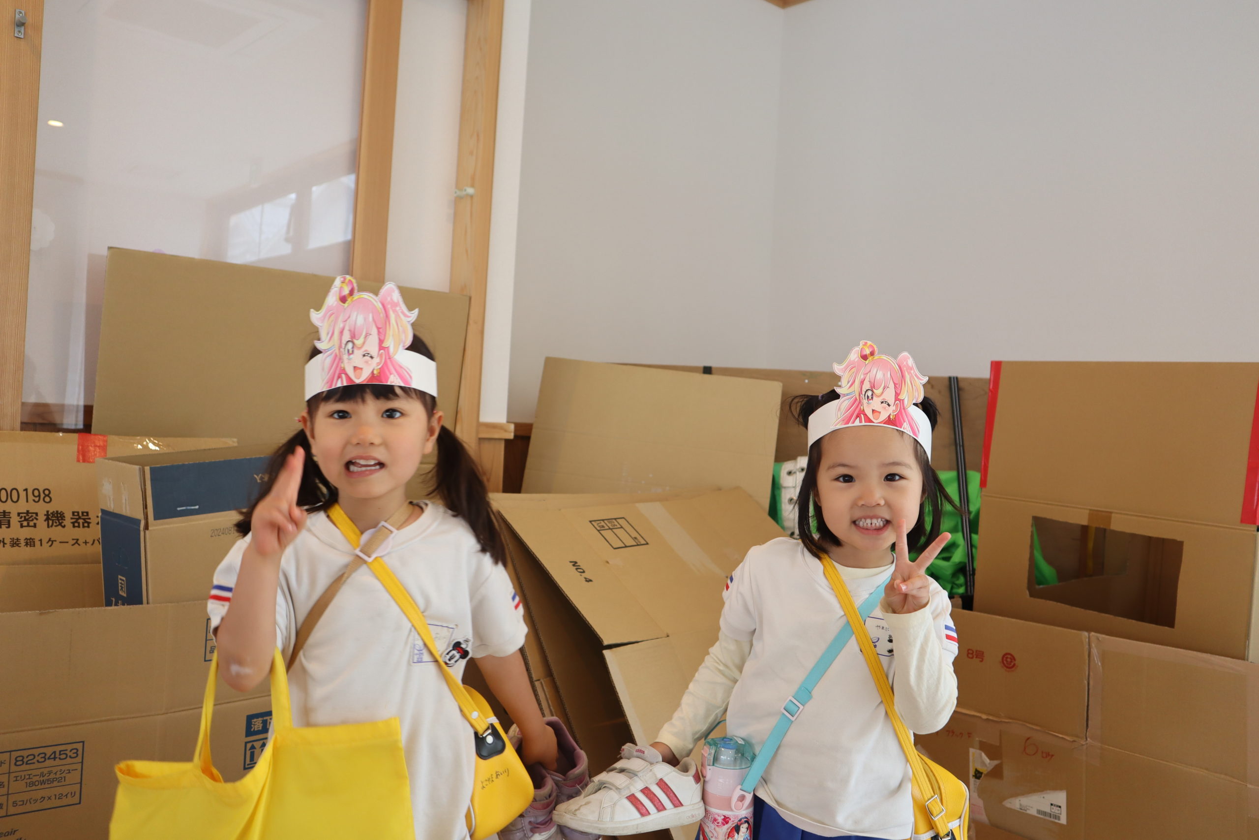 段ボールをいっぱい使って遊びます。お面を被って元気に登園してください。