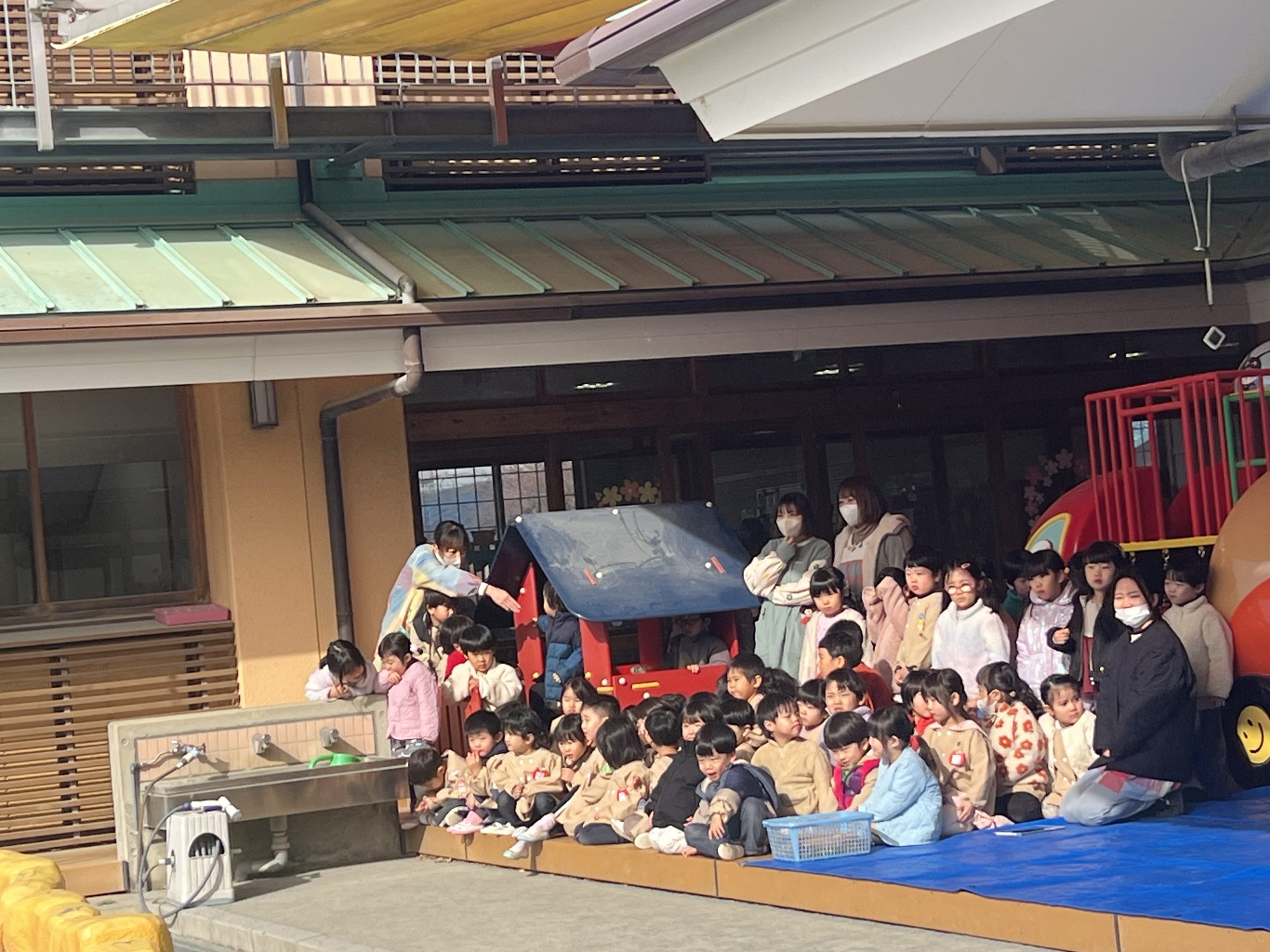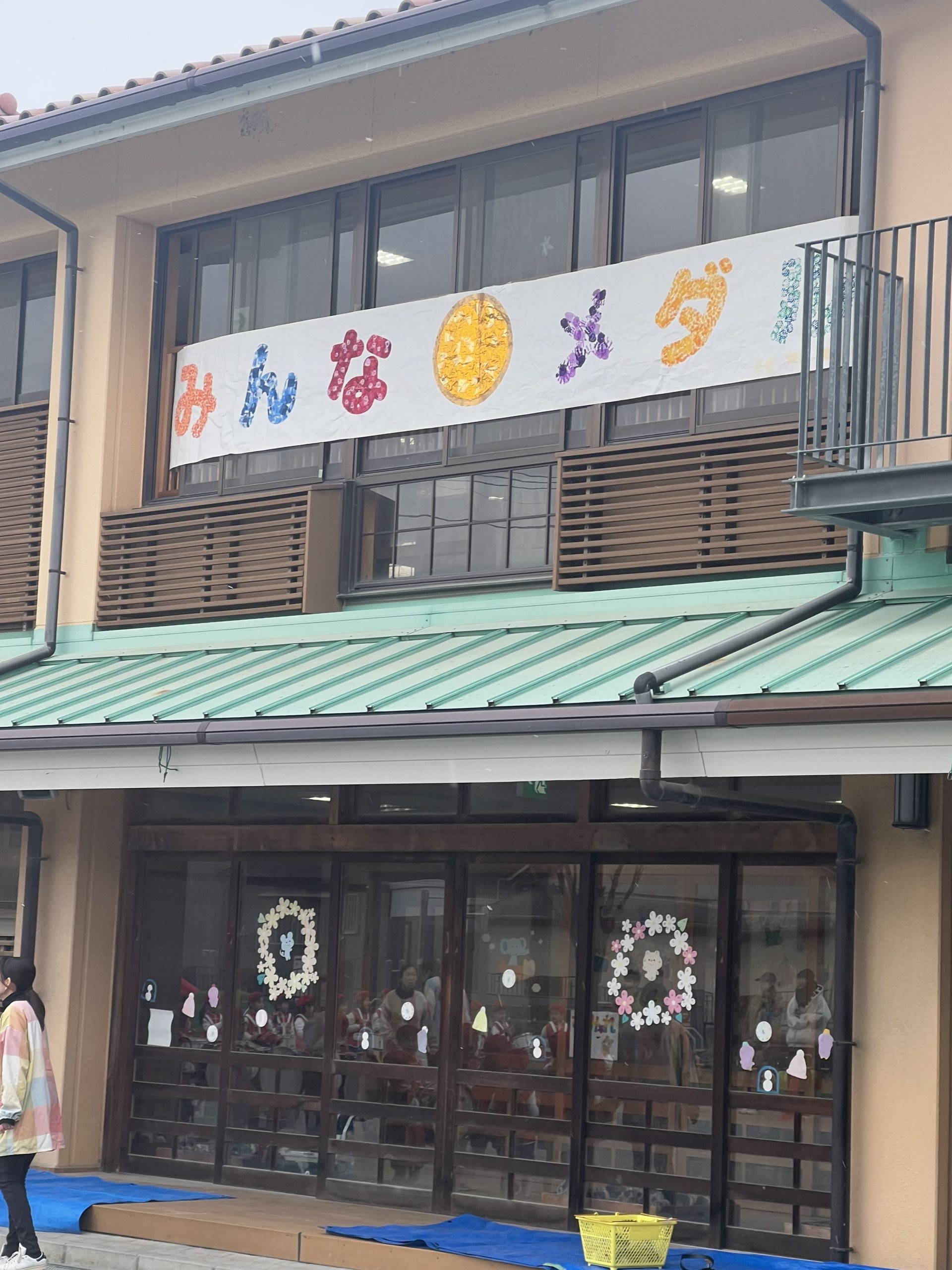 風は冷たく時折雪がちらちら、どんよりした雲が幼稚園を覆っています。