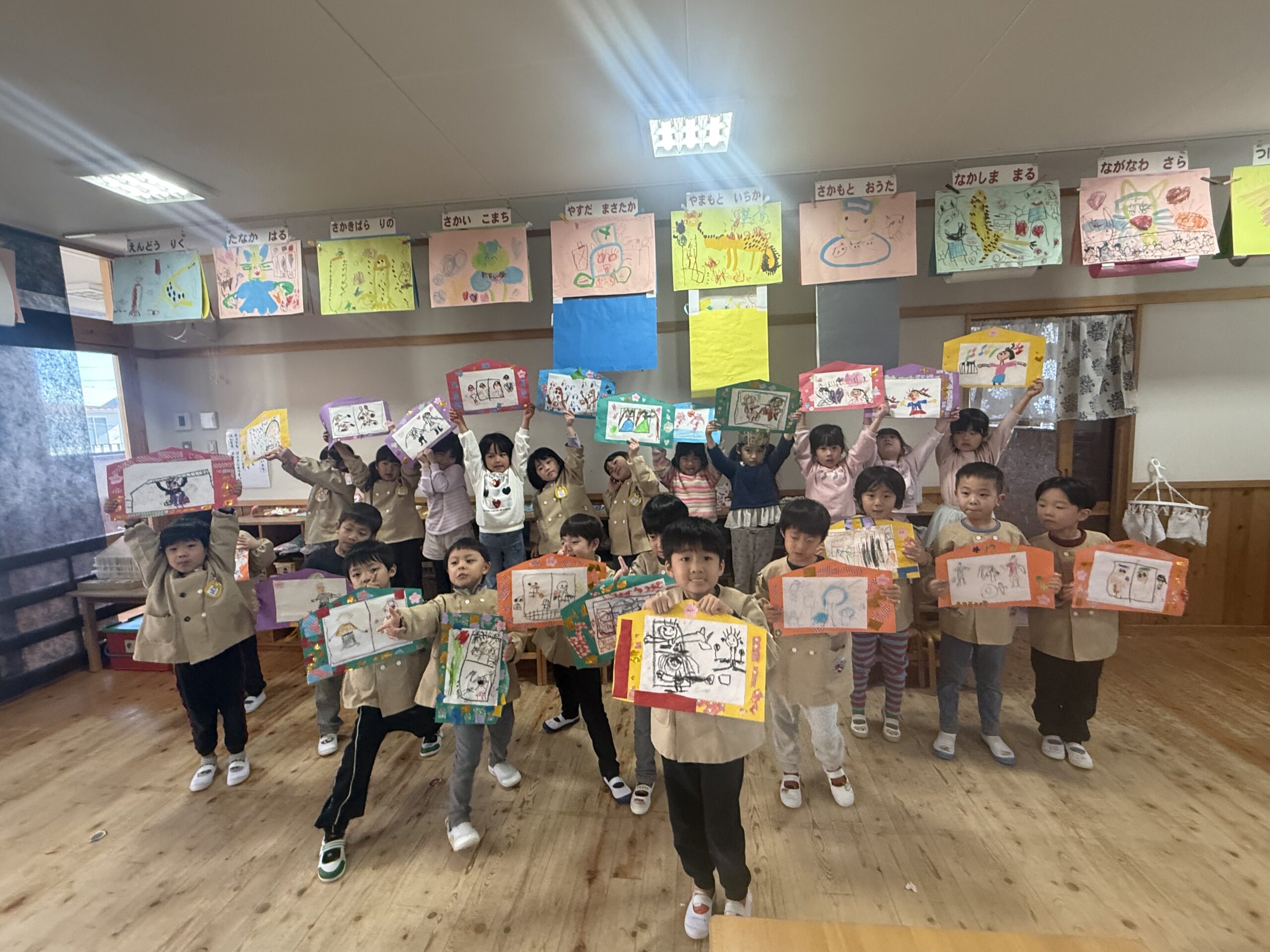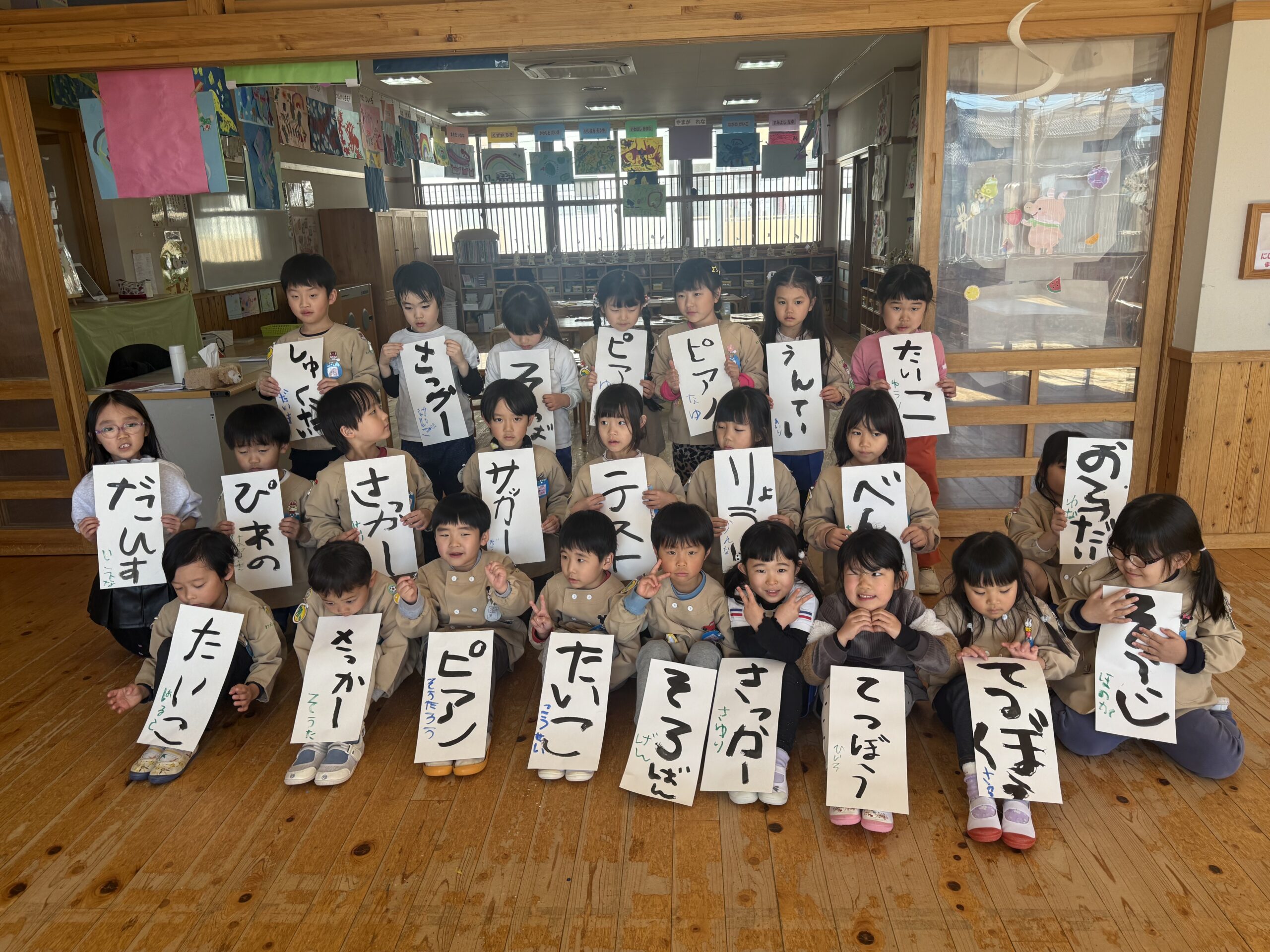 今年初めての幼稚園で、年長組のみなさんは「書初め」、年中組のみなさんは「絵馬つくり」をしました。