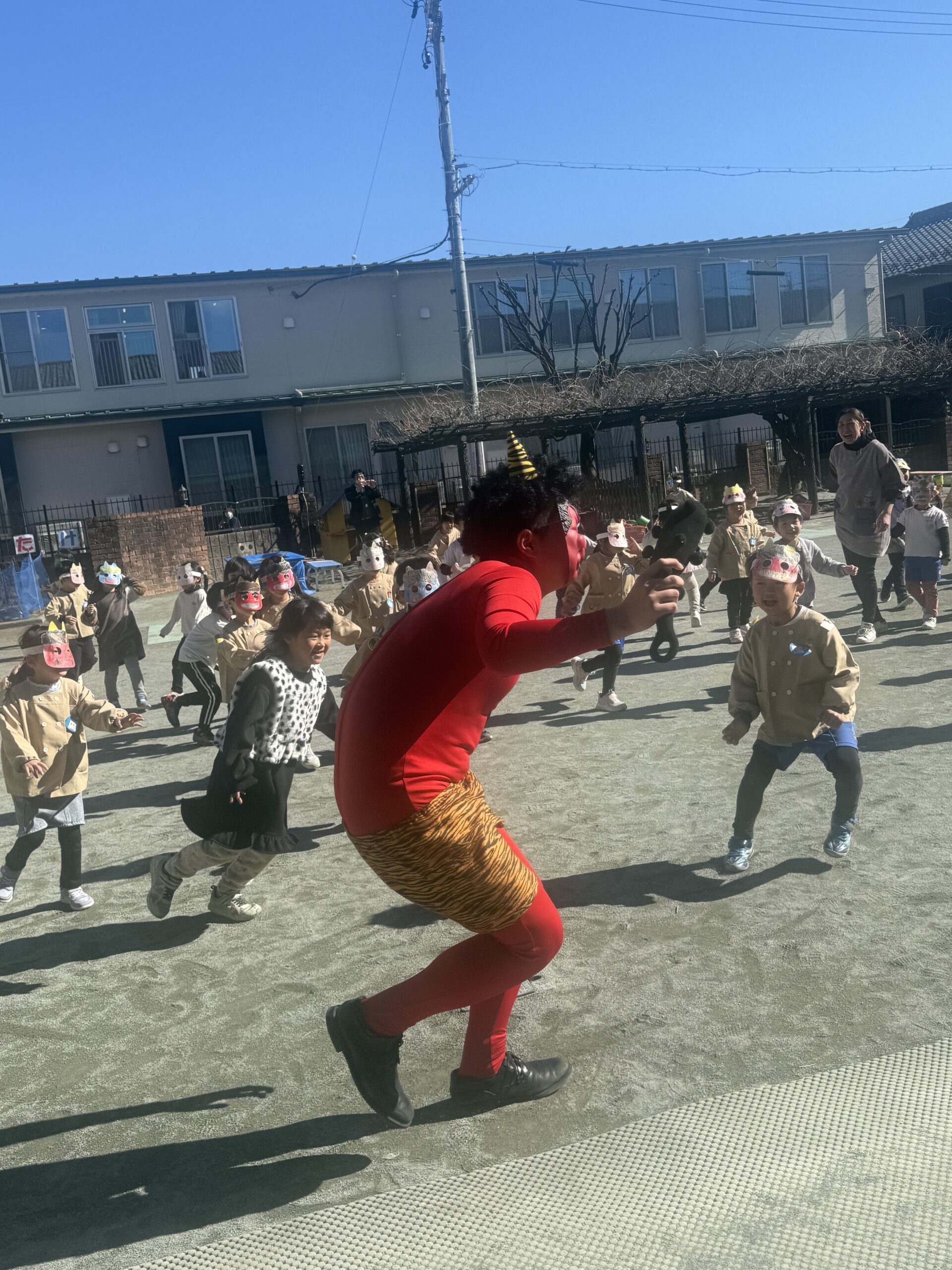 お部屋で豆まきをした後は、外に飛び出し赤鬼や青鬼を追いかけて、鬼ごっこ・・・