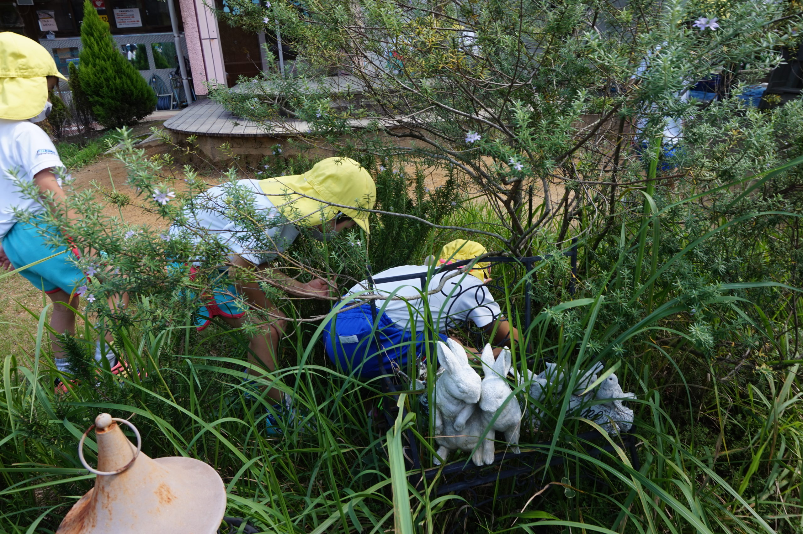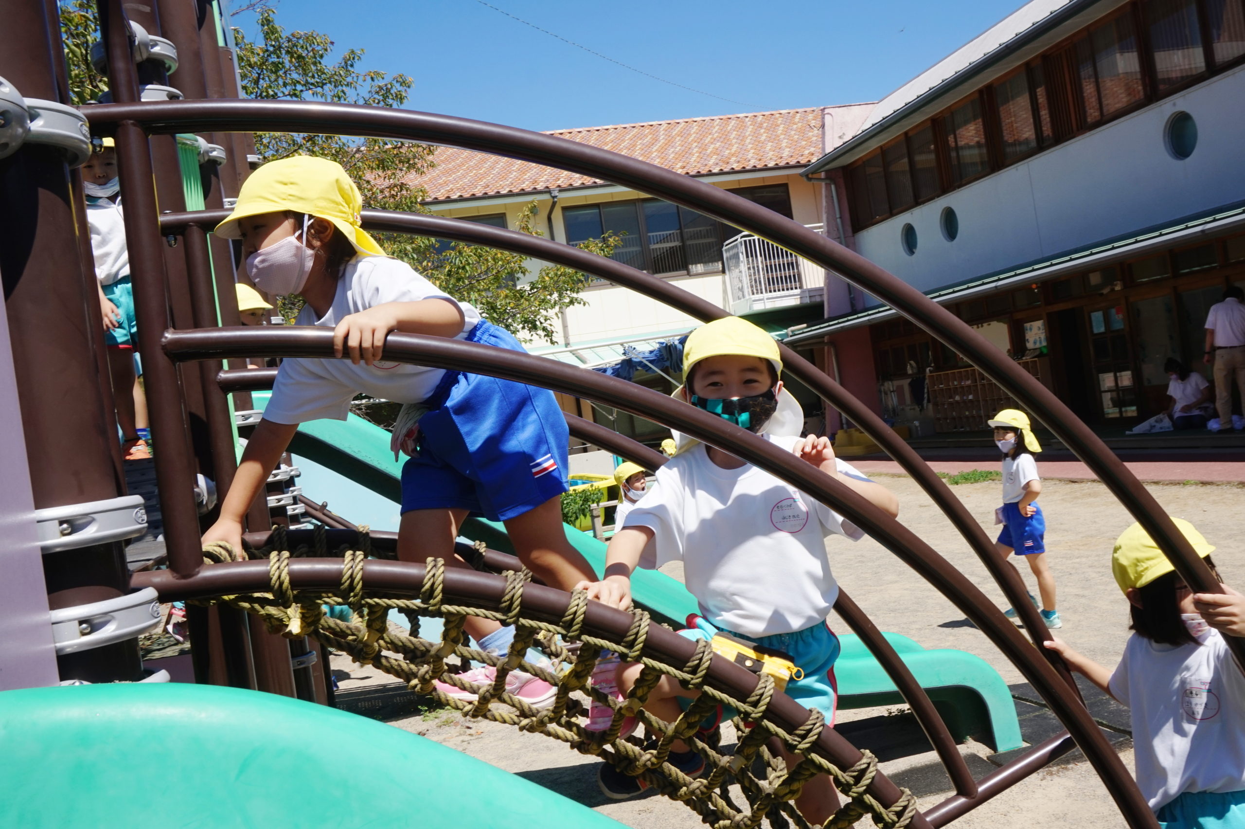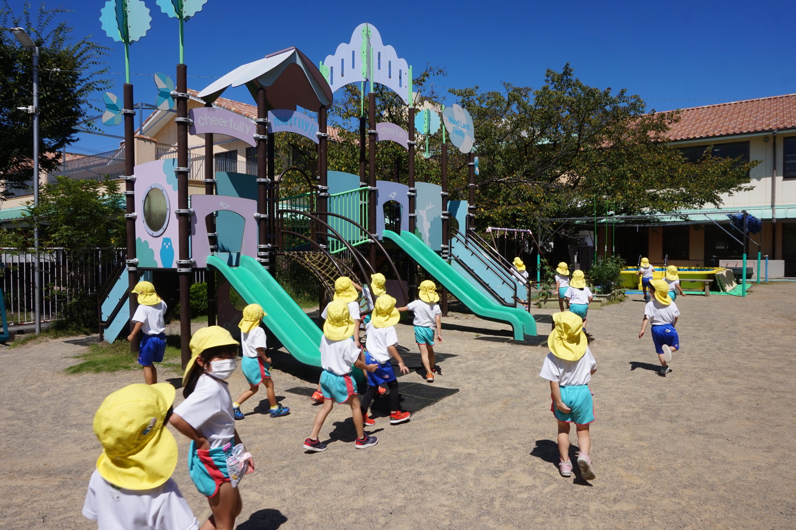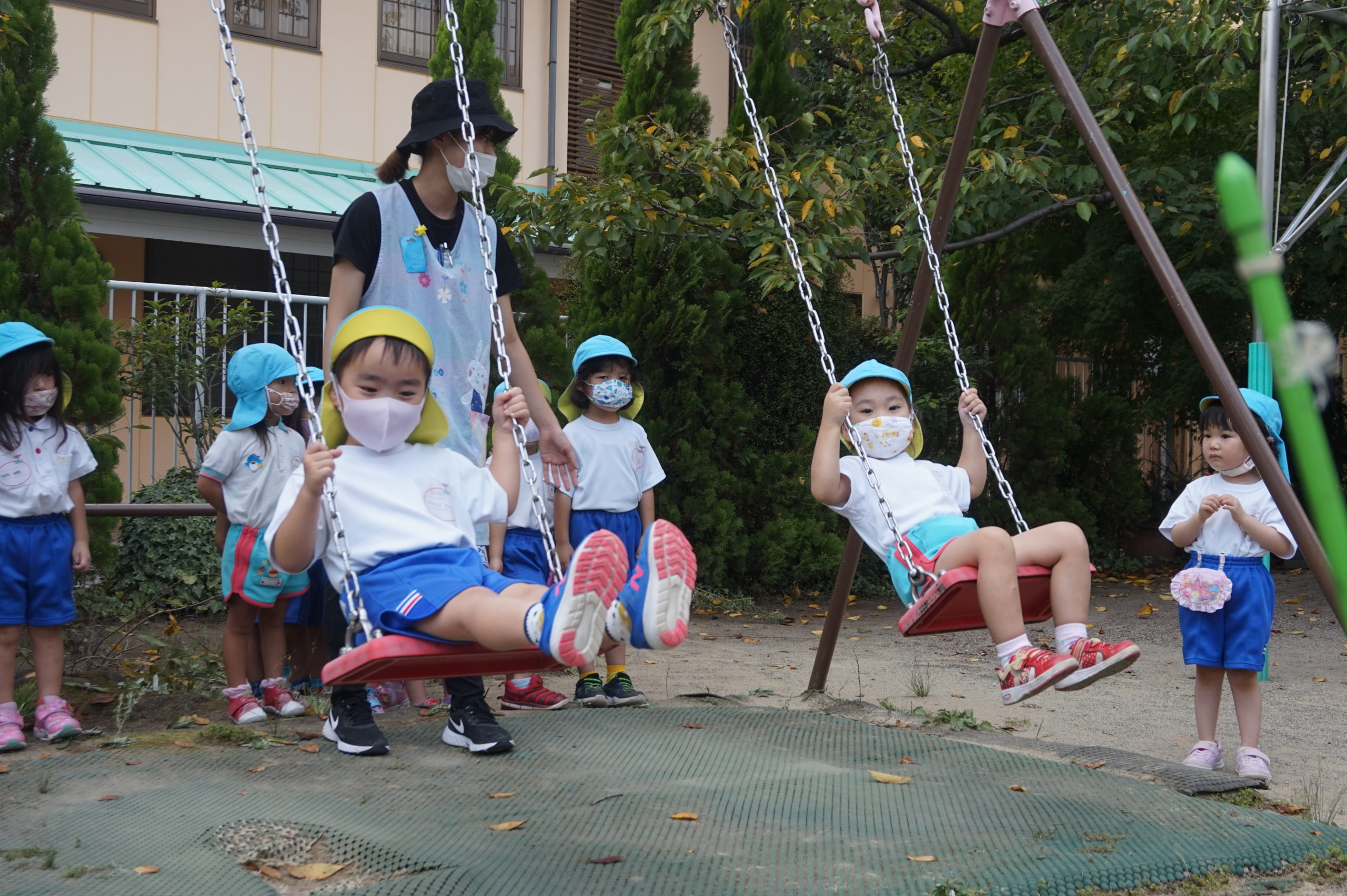 ぶらんこには行列ができてしまいましたが、遊んでいく中で「30かぞえたらこうたい」とルールを決めて・・・流石年長さんです。ルールというのは、守るのと作るのと両方が大切です。自分たちで考えて作っていく体験が必要であり、今回は仲良く遊ぶために生まれたルールです。風をきる気持ちよさとどこまで高く漕げるのか味わうスリル、楽しみながら自分の限界にチャレンジしていくのもぶらんこの醍醐味です。青空を背に風をきって満面の笑みで子どもたちが飛んでいる姿は、チャレンジする喜びそのものです。また、草むらではショウリョウバッタ獲り。9月の風を肌に感じ自然を満喫することをみんなが楽しみました。