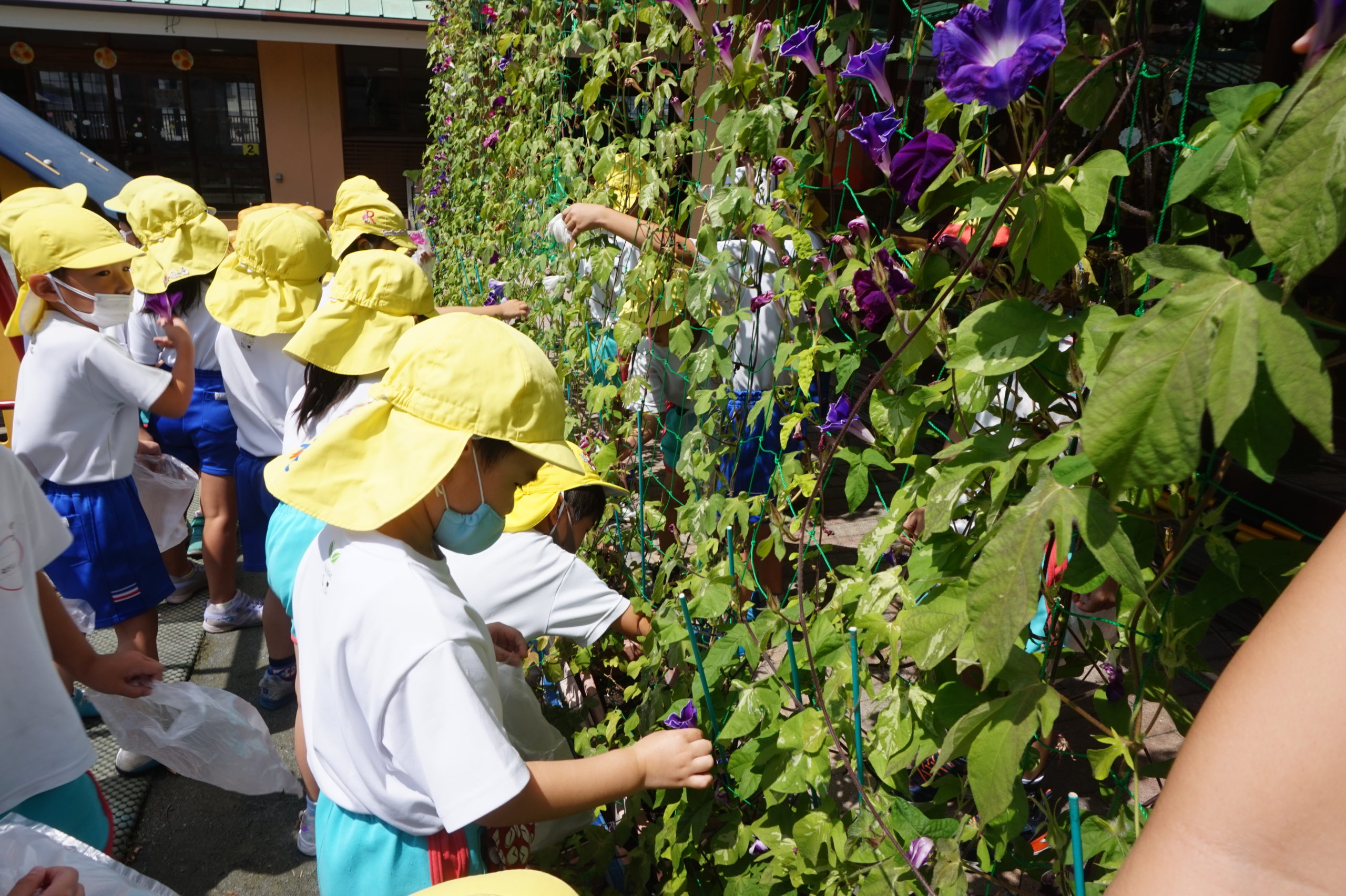 夏の間、毎日色とりどりのお花を咲かせた朝顔は、9月半ばになっても元気に咲いています。摘んだ朝顔で色水遊びをしました。ビニールに好きな色のお花を入れて揉んで揉んで、子どもたちから感嘆の声が上がりました。自由に色水を混ぜ合わせることで起こる色の変化を体験しました。色の違う朝顔で色水を作る子、「きれい」、「こんどは違うお花で作ってみたい」とどんどん色水あそびが広がっていきました。
