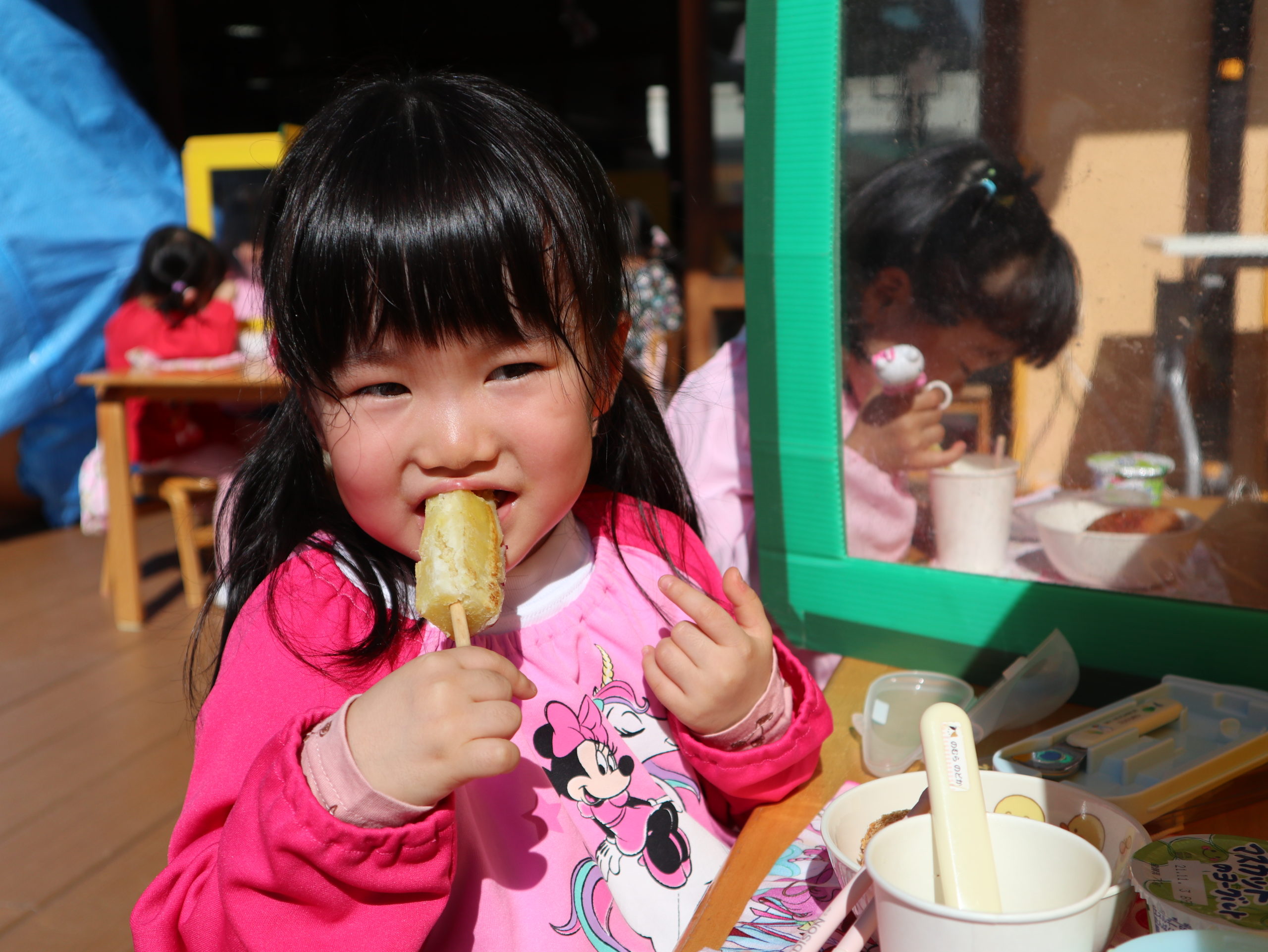 年中組さんと年長組さんが育てて収穫をしてくれたお芋で「POTETOパーティー」を行いました。POTETOパーティーの「入場券」をさしだして、扉を開けそれぞれの年齢にあったパーティーを行いました。POTETOパーティーも収穫祭の一つです。収穫祭は田や畑の作物の収穫に感謝と翌年の豊作を祈願して行われるお祭りです。恵まれた生活をしている私たちですが、食べ物に感謝の気持ちや恵まれた環境に感謝する気持ちを忘れないで大事にしていきたいと思います。子どもたちが給食に唱える挨拶が浮かびます。食前のことば「多くのいのちと、みなさまのおかげにより、このごちそうをめぐまれました。深くご恩を喜び、ありがたくいただきます。」食後のことば「尊いおめぐみをおいしくいただき、ますますご恩報謝につとめます。」胸に届きます。苗から植えて根っこが張りそれがお芋に育ちずっと見守ってきた年長さんや年中さんの収穫したさつまいもを、一回目はお芋ご飯、二回目はお芋巾着、そして今日はポテト焼きを味わうことができ格別に美味しく感じられたことと思います。あきこ先生の口ぐせレシピに従い「バターたっぷり、お塩パラパラ」でホットプレートで焼き上げました。子どもたちは「おいしい」「おいしい」「ありがとう」と言って食べてくれました。その気持ちに準備した私たちも嬉しかったです。子どもたちのとびっきりの笑顔はゆか先生がカメラに収めていましたよ。楽しみです。