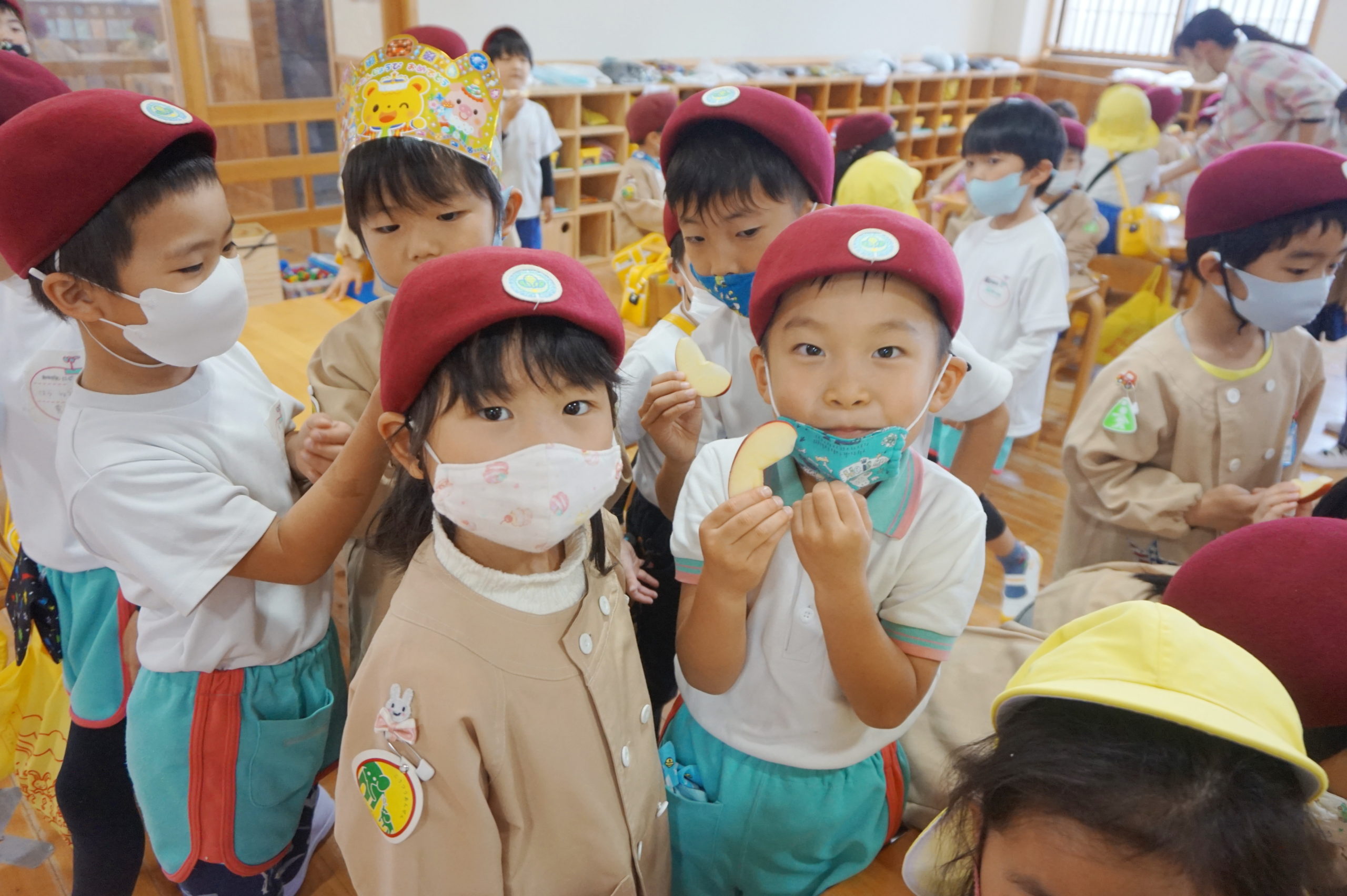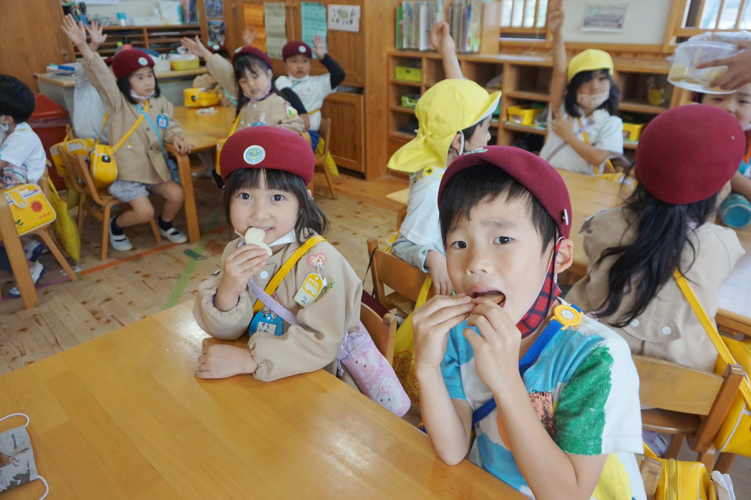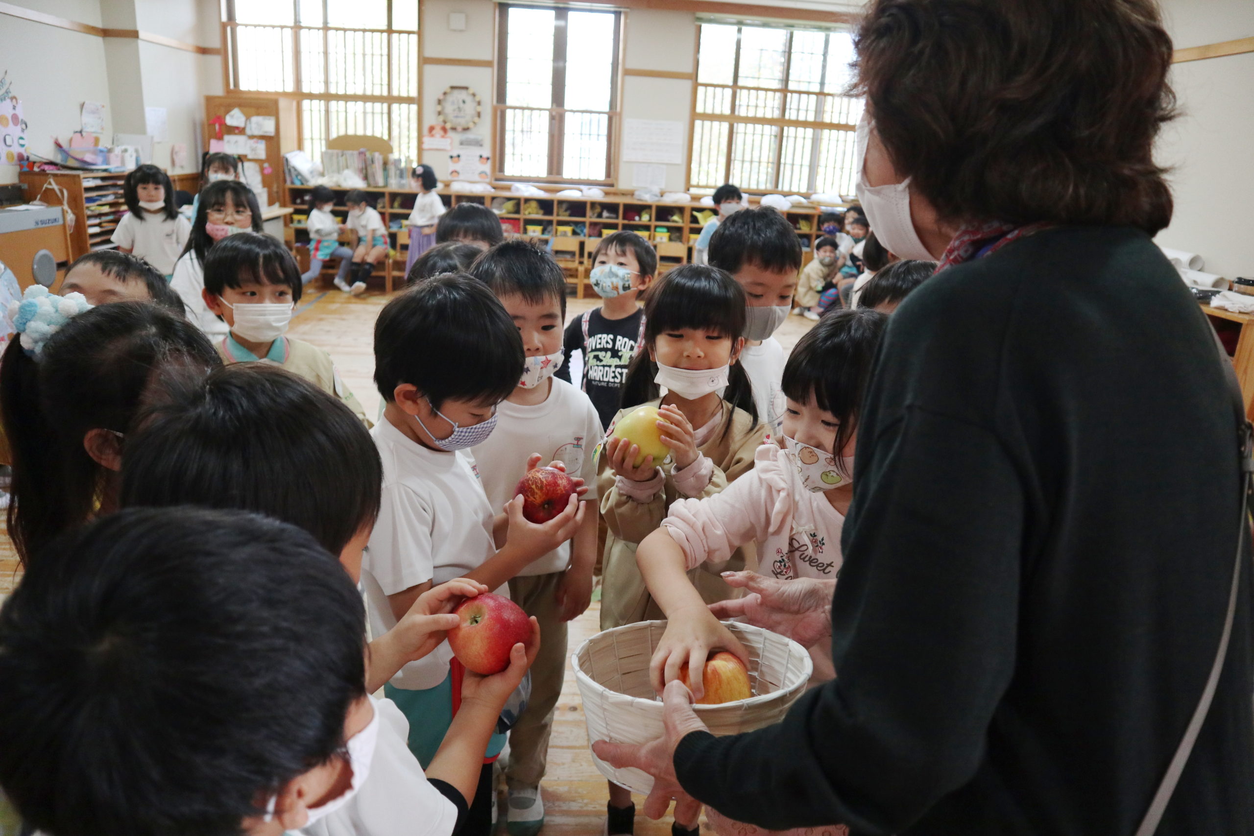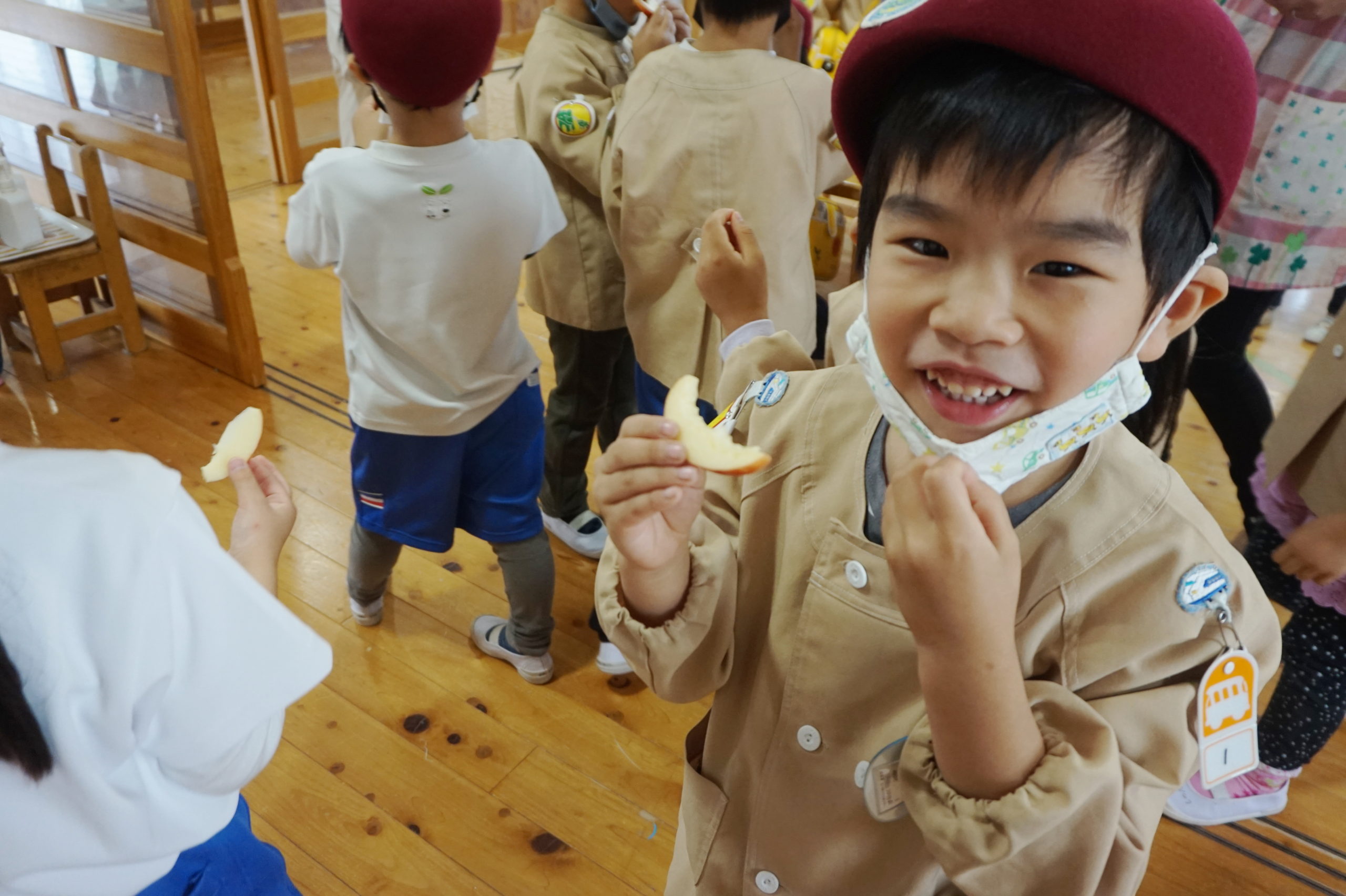 最後は美味しいりんごをみんなで分け合って食べることにしました。面白いことに私の前に来てドタッ!と倒れるおちょけた子もいました。「えんちょうせんせい、ありがとう」と言ってくれる優しい子どもたち