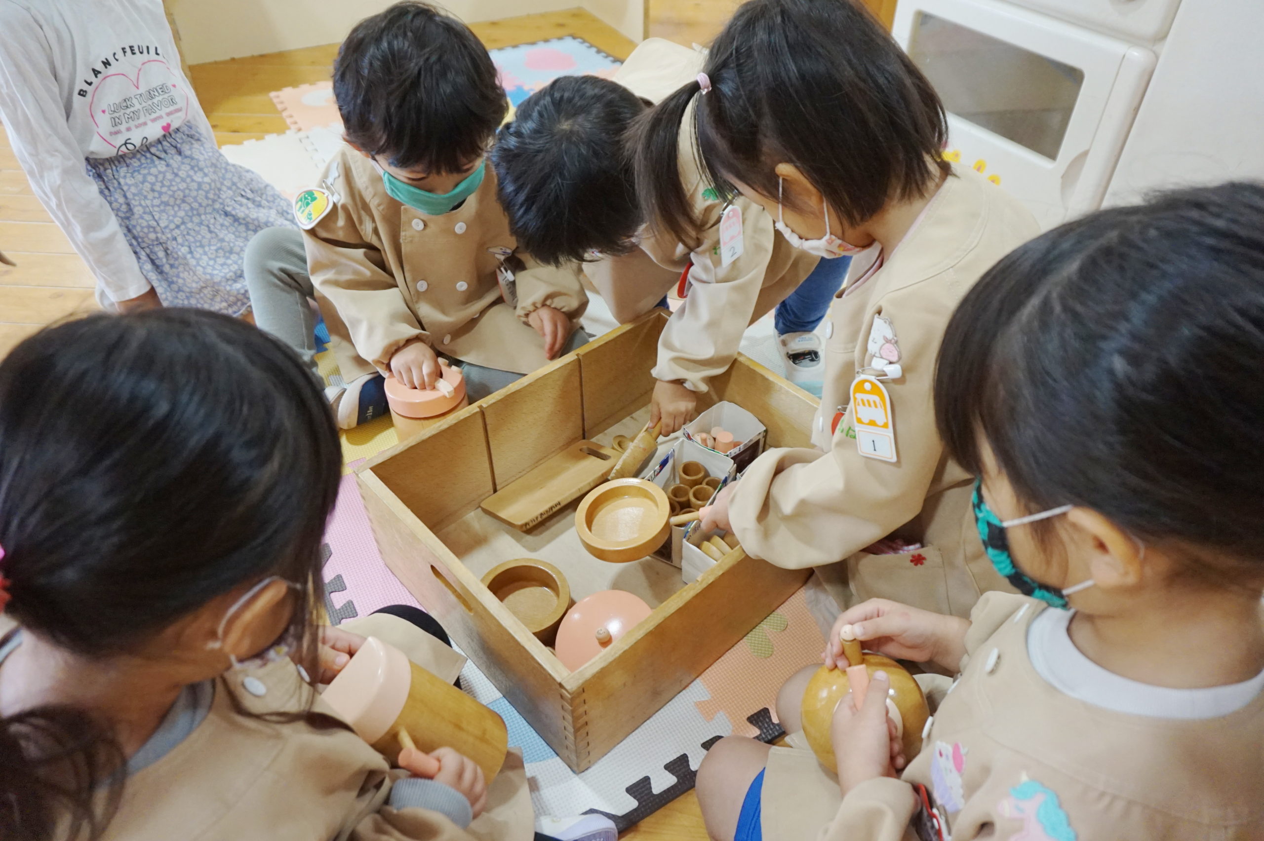 MIYOTTOの前がおままごとコーナーになっていますが、朝と帰りの遊びの時間には小さな木のお茶わんやお皿が並んでいます。遊びが終わると子どもたちは見本のようにきれいにお片付けして教務課に運んでくれます。おままごとは男の子も女の子にも大事なあそび、お家のママやパパの延長線です。生まれてから成長する過程で、子どもは周りの環境をどんどん吸収していきます。身近な大人の普段からやっていることに興味津々です。それを自分の手や足を使って真似をしたり想像したりすることが子どもがこの世界で生き方を学ぶ大事なプロセスです。幼稚園にはたくさんのこどもママがいます。