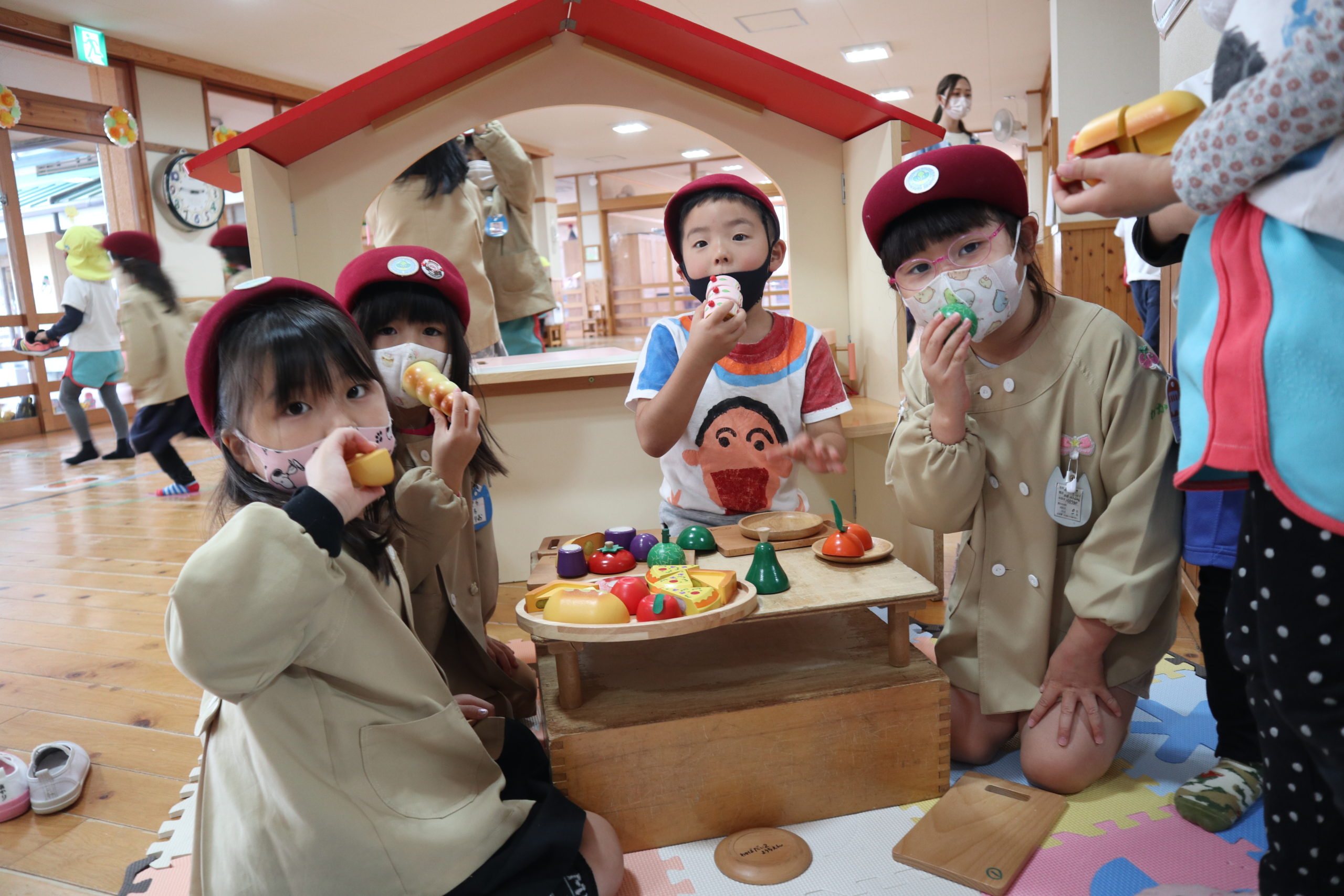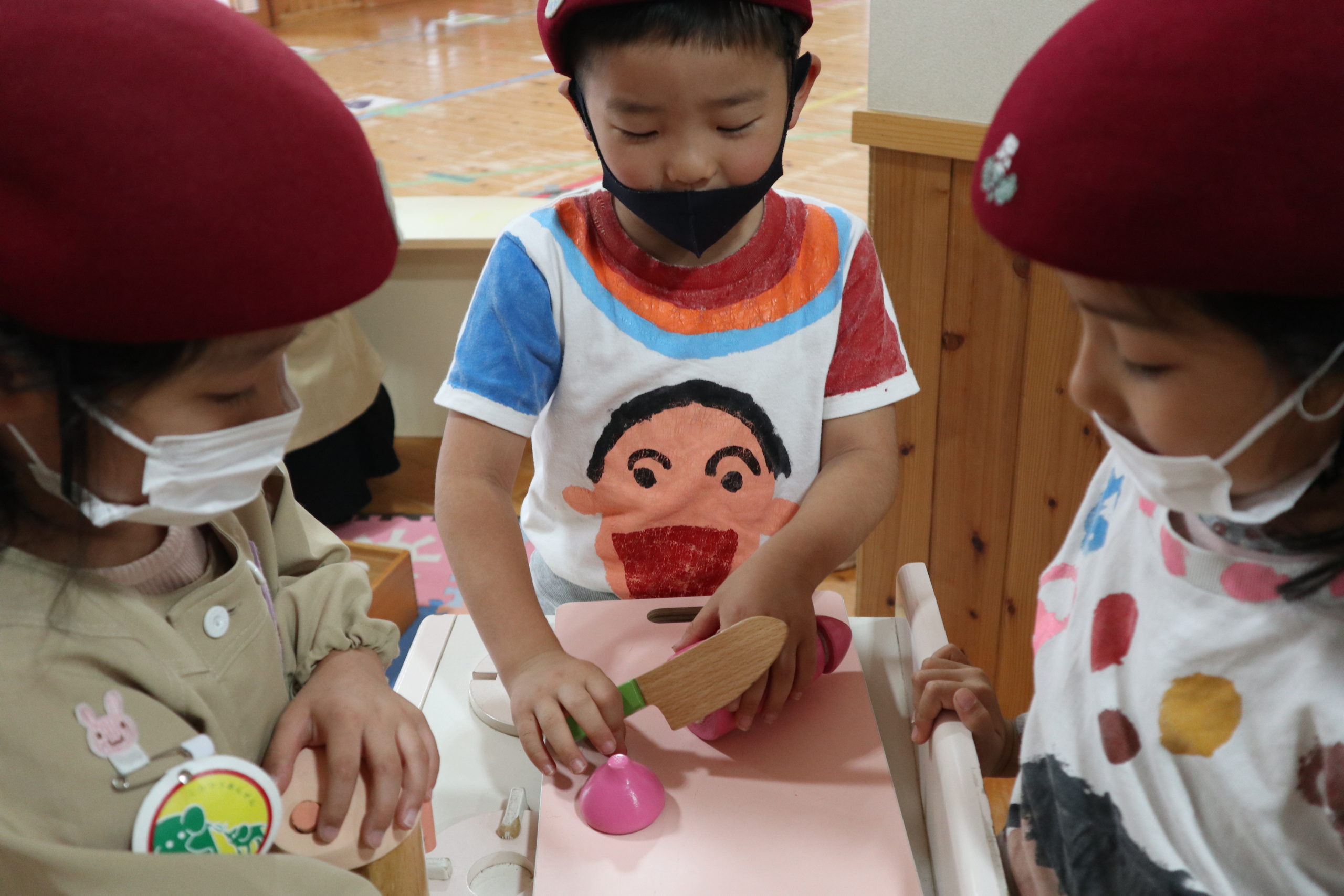 今朝、ひまわりのななみちゃん、みどりちゃん、あおと君の3人がもじもじしながら教務課にきました。なにか言いたいことがあるようです。「なんですか?」すると「おもちゃかしてください」とちいさな声でお話してくれました。3人の勇気を合わせて言ってくれたのでしょう。いつもは年中組の子どもたちが準備をして始まるおままごとです。