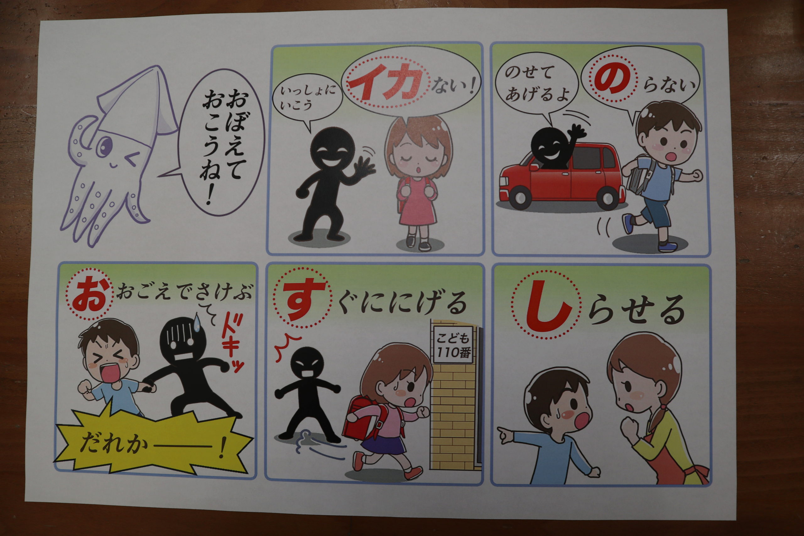 「いかのおすし」とは、「知らない人についていかない」など、こどもたちが身を守るための行動をまとめた標語で全国的に使われているものです。