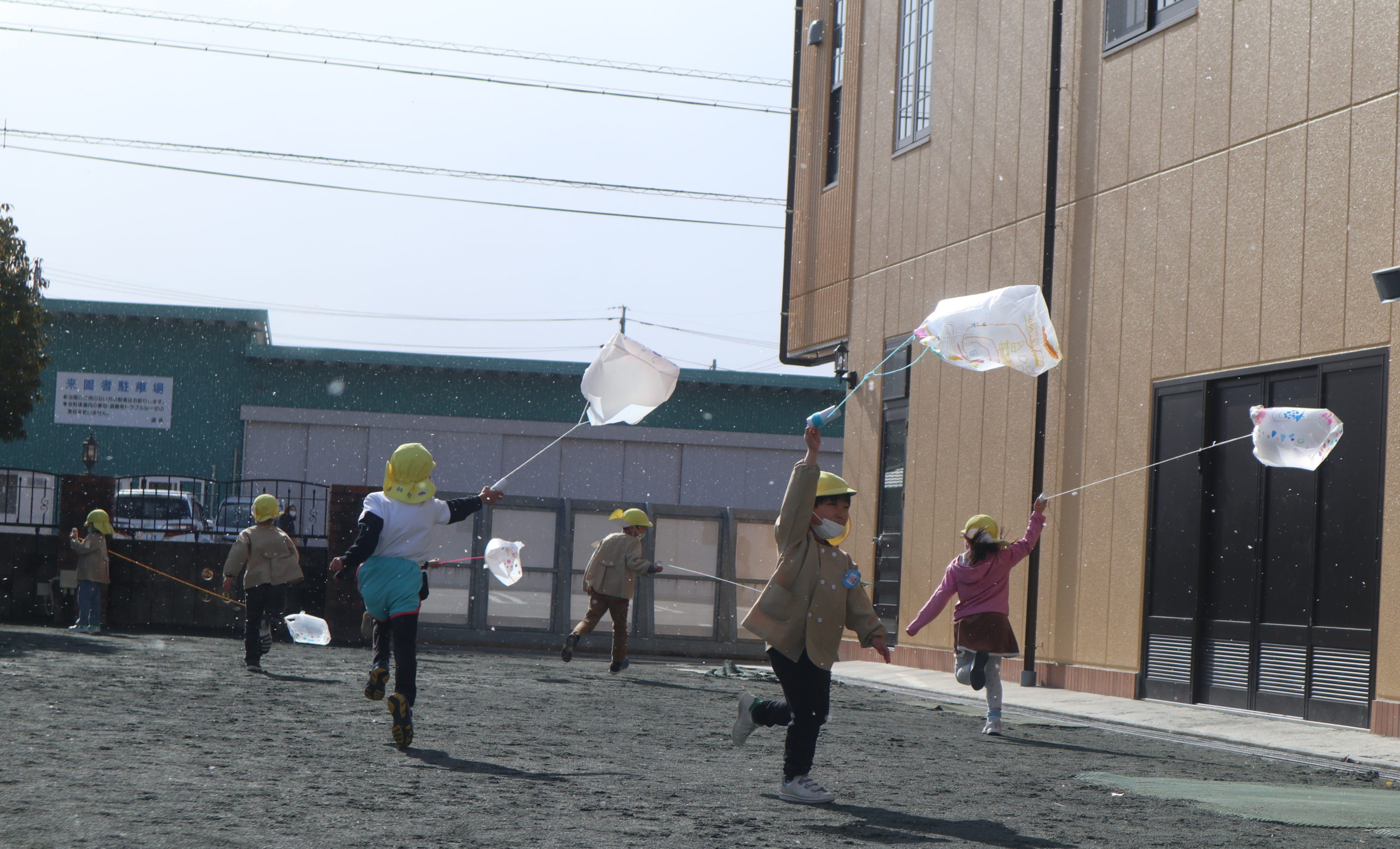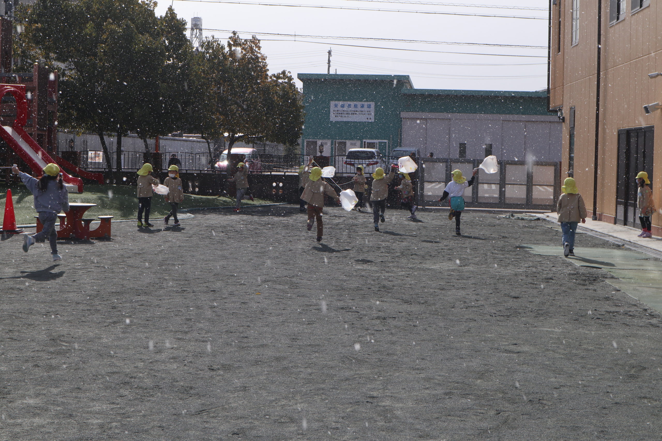 すると、お昼ごろにじ組さんが凧をもって園庭に、なんと雪が・・・・・。一年で一番寒さを感じる時期です。