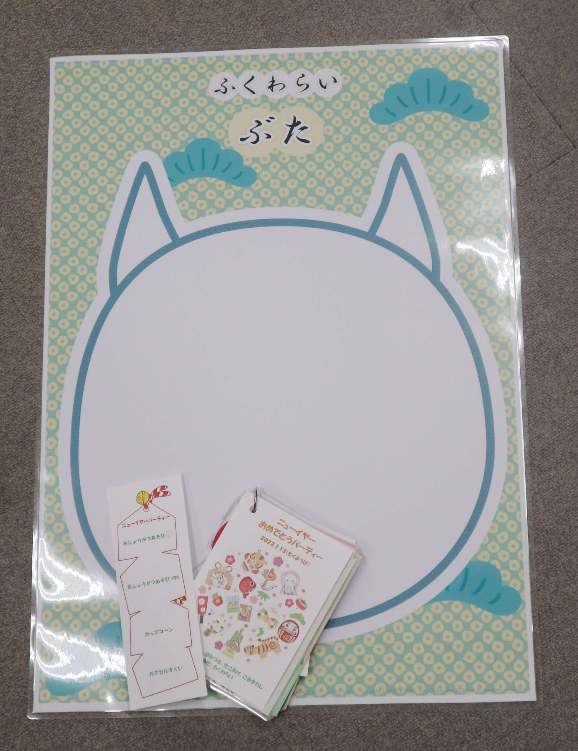 みなさんの手の入ったけん玉やたこや福わらいも準備したよね、そして大きな動物福わらい・風船はごいたやこま廻し・ふわふわドーム、